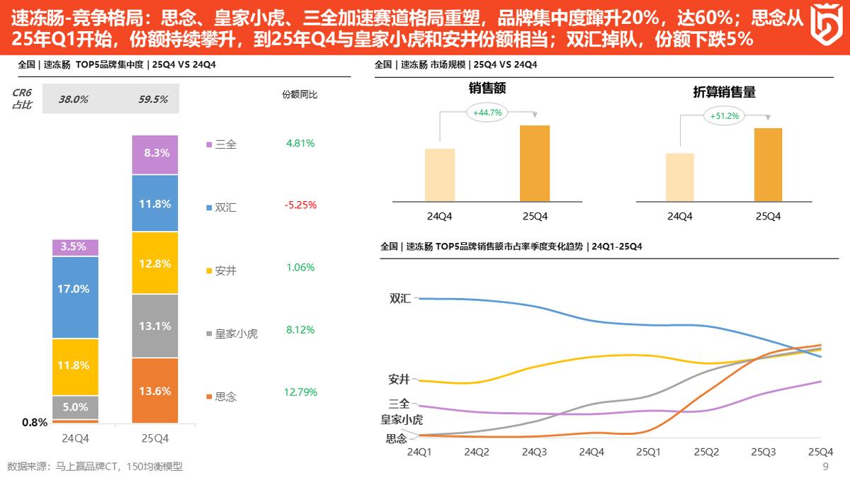 速冻肠类目发展非常快速,从右上角的市场规模来看,整个速冻肠类目的销售额和销售量在2025Q4分别同比增长了44%和50%,增长非常显著。