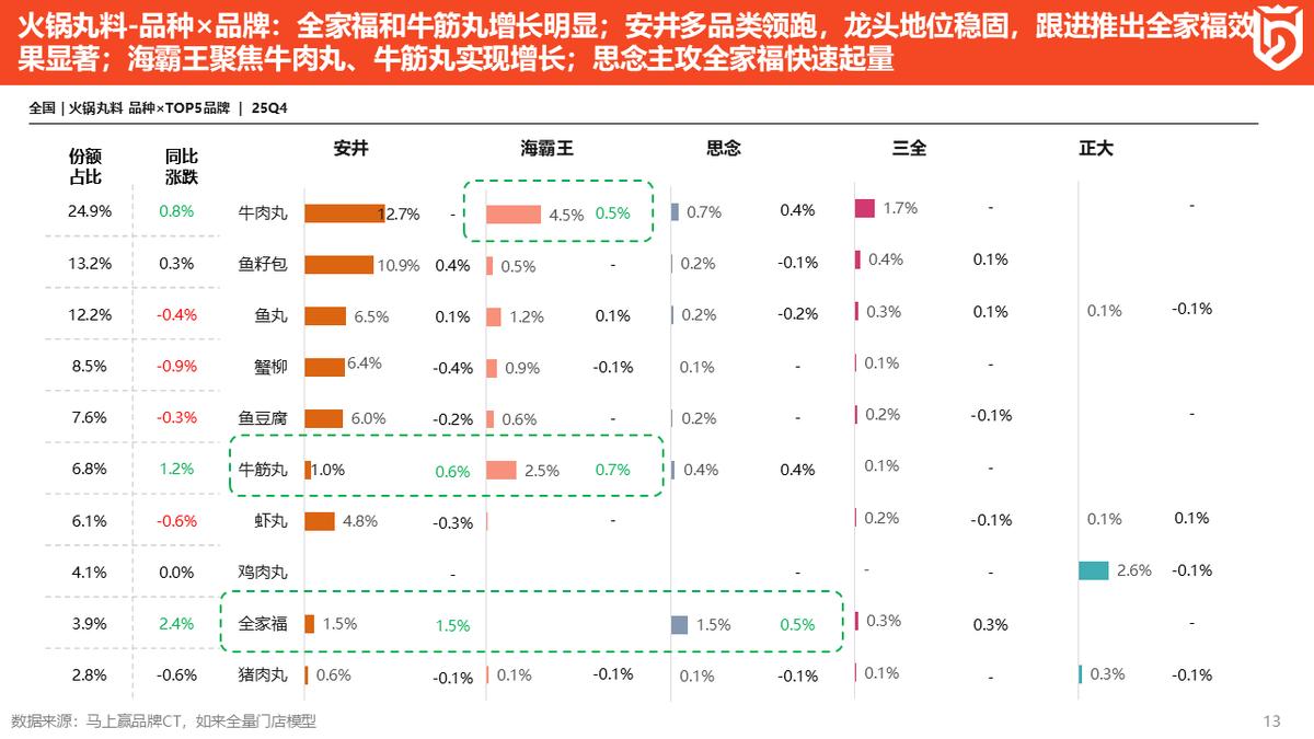 从各品牌分品类的同比涨跌来看,安井和思念在全家福品类增长非常显著,同比增长分别为1.5%和0.5%,进而带动了类目的增长,全家福类目同比增长了2.4%,成为火锅丸料中增长最显著的品类。