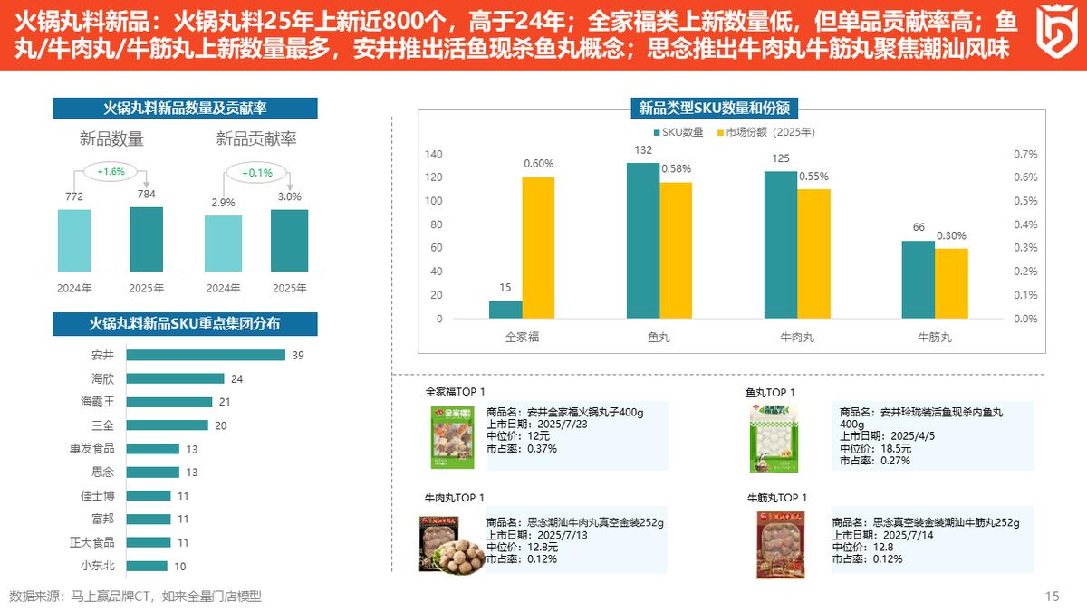 接下来看火锅丸料的新品表现,其新品创新相比前面的速冻肠品类稍微弱一点,新品数量同比只增长了1.6%,保持在700+的体量内,而新品贡献率在3%左右,相较去年提升了0.1%,变化较小。从左下角的集团分布来看,上新最多的集团是安井,有39款新品。