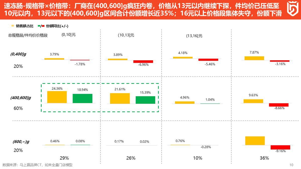 接下来从速冻肠各个品类的规格带X价格带形成的矩阵中来看产品布局。上图纵轴表示它的单件规格带,横轴表示单件价格带,规格和价格交叉出不同的区间,黄色表示该区间在类目整体中的销售额占比,绿色/红色则表示该区间的占比同比增长/下滑。马上赢将速冻肠分为 0 ~ 400 克, 400 ~ 600克、600克及以上/件三个规格带,以及0-10元、10-13元、13-16元、16+元/件四个价格带。
