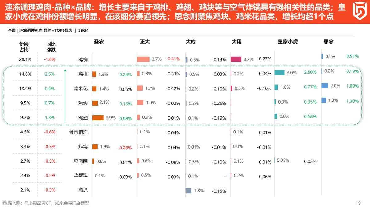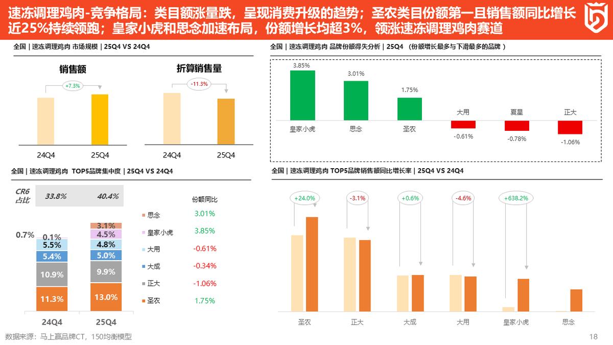 从销售额同比来看,圣农同比增长了24%,皇家小虎同比增长高达638.2%,思念则由于2025年才开始在速冻调理鸡肉类目发力,因此未提供销售额同比增长率数据。