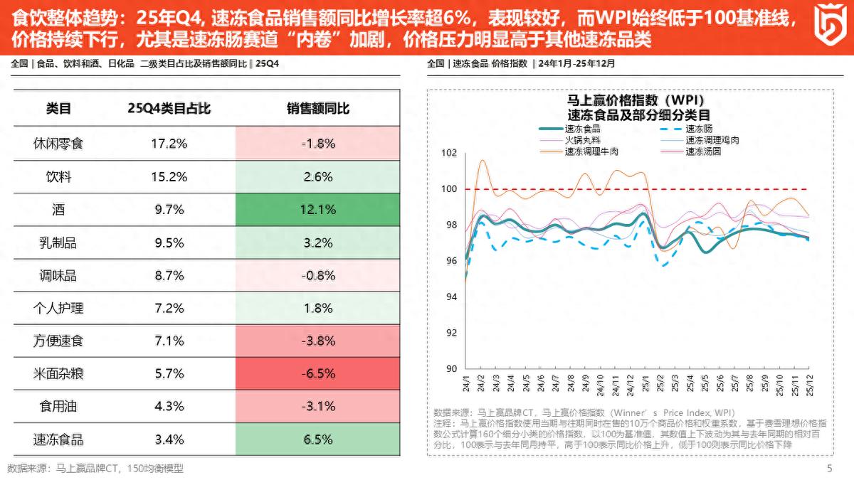 2025Q4相比于前两个季度,食饮各类目整体要表现稍微好一些,有很多积极的信号。左边这张表,我们列举了快消品行业的10个主要品类,包括休闲零食、饮料、乳制品、速冻食品等。其中,速冻食品的类目占比虽然比较靠后,但是销售额同比增速则在所有品类中位居前列,2025Q4同比2024Q4增长了6.5%,在所有选择的类中排名第二。