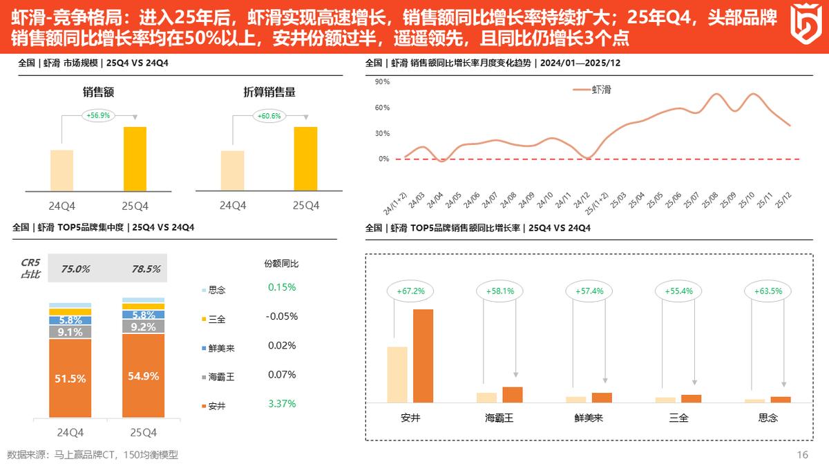 接下来看虾滑类目的情况。虾滑除了涮火锅,还可以作为饺子、包子等的馅料,相对于一般火锅丸料而言适用场景更丰富,类目的市场规模在2025年也实现了高速增长,虾滑的销售额同比增长56.9%,折算销售量同比增长60.6%。销售额变化上,虾滑类目在2025年上半年销售额同比增长率一路攀升爬坡,2025下半年也在波动中保持较高的同比增长率。
