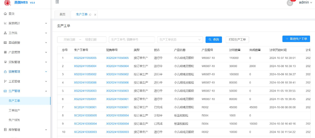 2、生产管理模块支持生产工单创建、工单排产、报工管理等操作,可自动计算物料需求区分外购、委外加工或自产类型,同时通过生产看板实现工单数据可视化,实时监控生产进度;