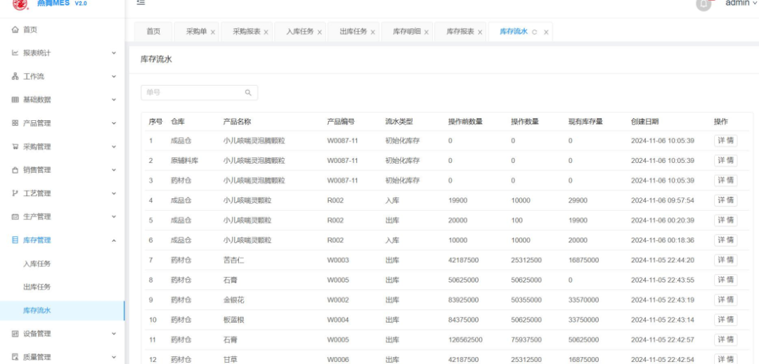 4、进销存(库存)管理模块支持1000种物料规格管理,包含入库/出库任务处理、库存流水追溯、库存预警、临期预警等功能,可导出预警列表与库存明细,还能配置物料出库策略、容器管理、批次管理及保质期管理,满足精细化库存管控;