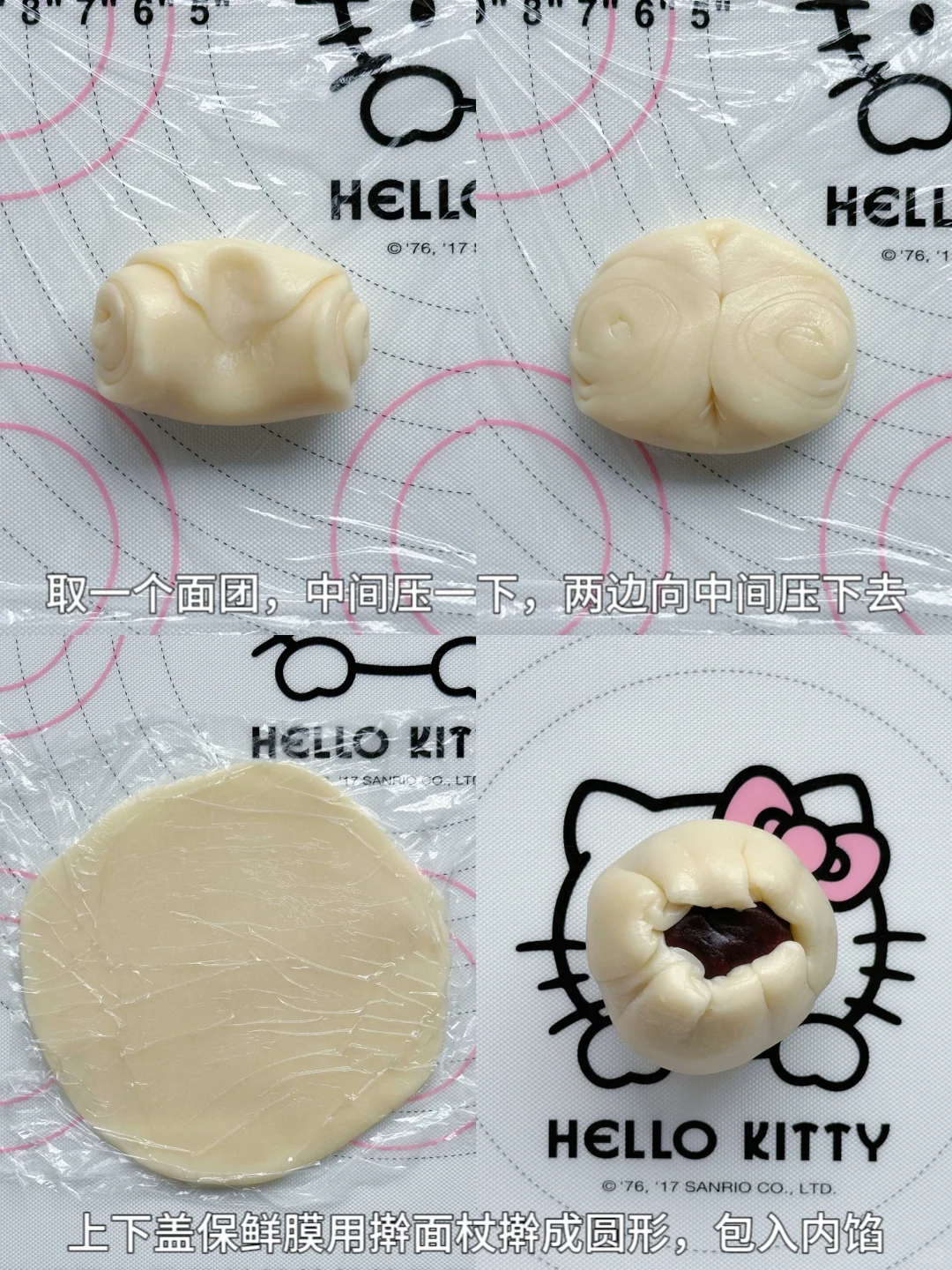 🐾取一个松弛好的面团卷,用手指从中间按下去,再将两头向中间压,用擀面杖擀成圆形,放入馅料,贴紧馅料包好,收口出捏紧。