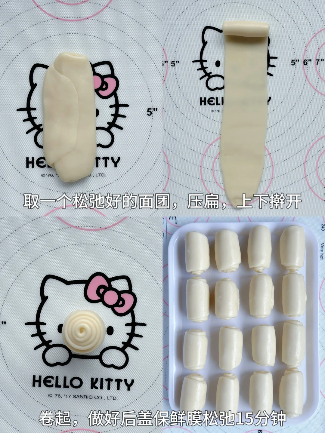 🐾取一个松弛好的面团卷,拍扁,还是同上方法擀长, 卷起,松弛15分钟。