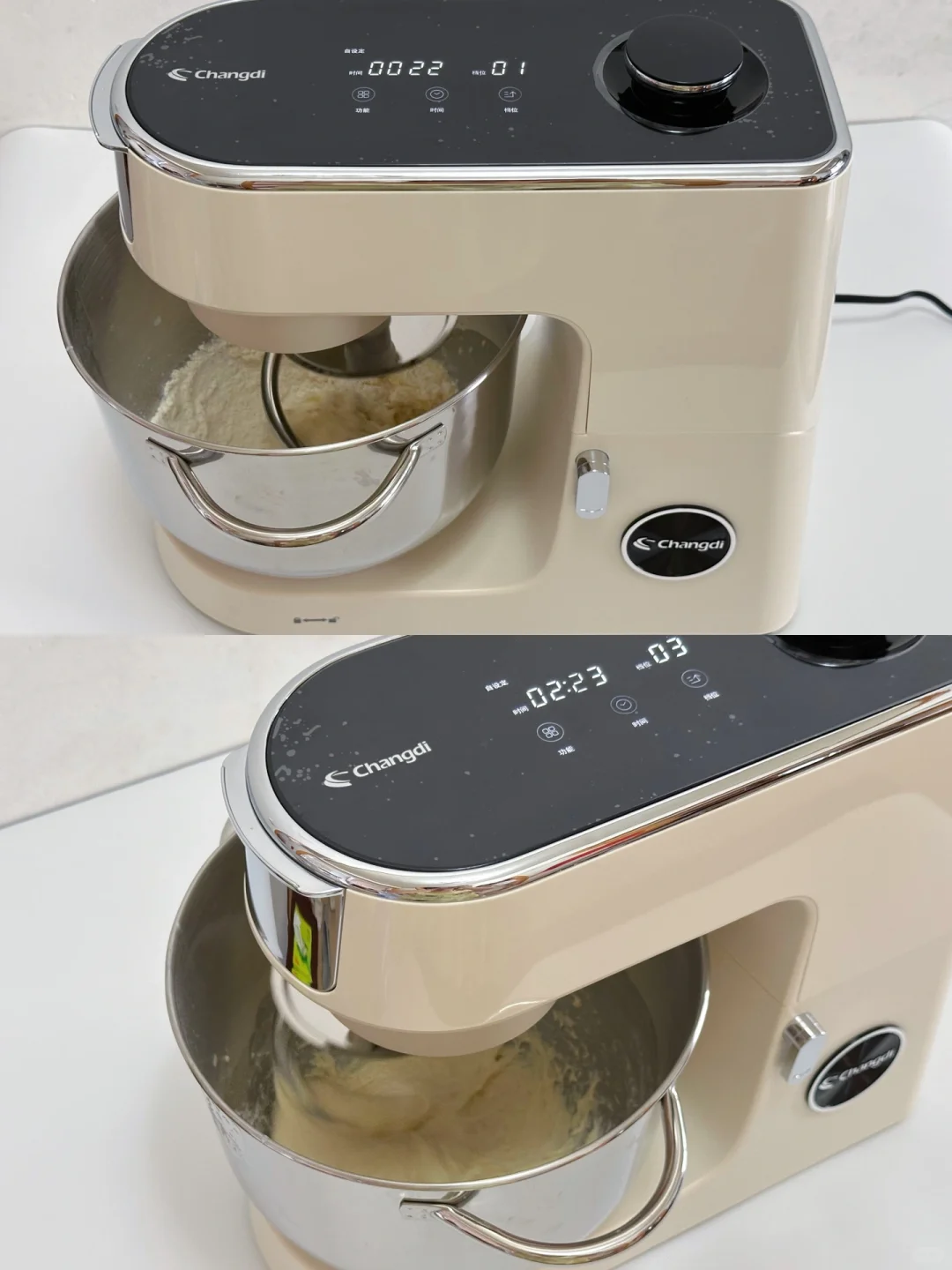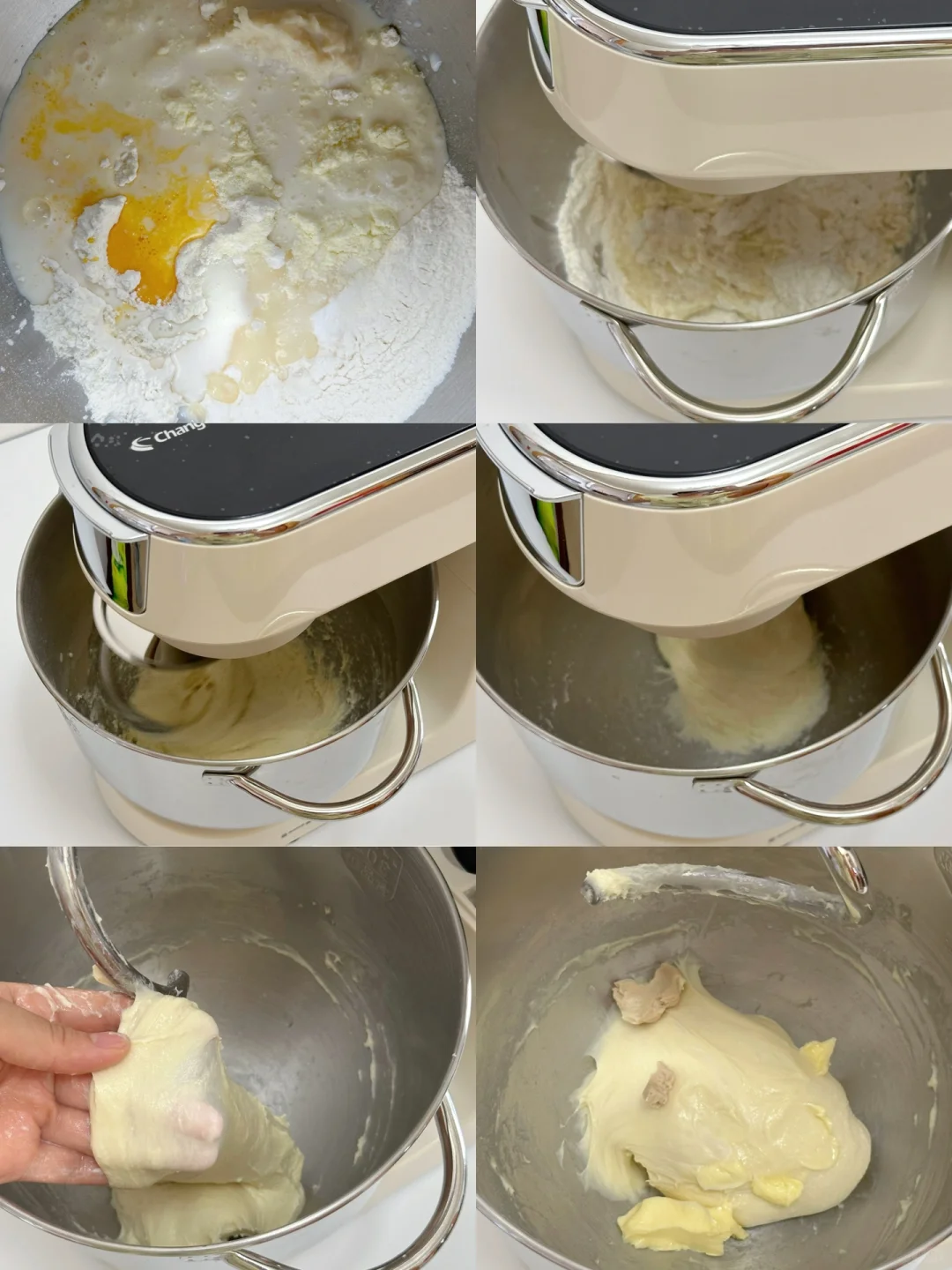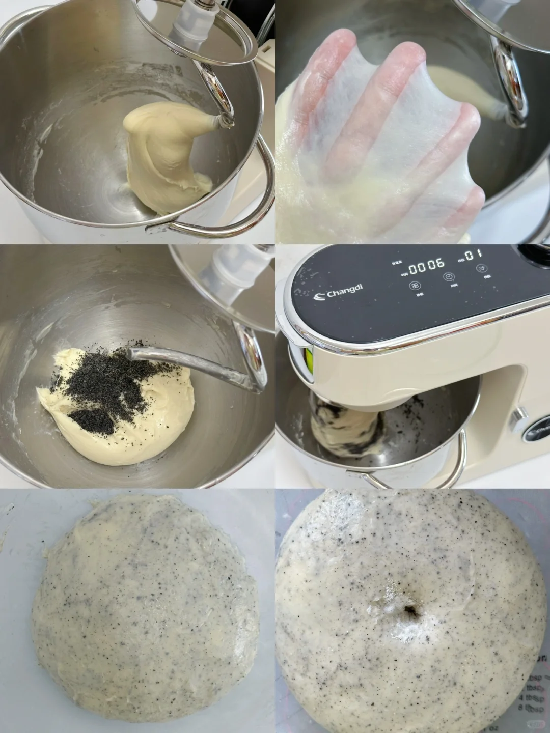 1️⃣除黄油、酵母以外的所有面团材料放入长帝 企鹅顶顶厨师机桶内,低速1~2档搅拌至无干粉,转5~6档打能扯出厚膜,加入软化好的黄油、酵母,开2~3档揉至黄油吸收,转5~6档打面至完全拓展阶段,能扯出薄膜即可。再加入黑芝麻粉,1档搅拌均匀。(新手怕面筋揉过了,此步骤也可以直接忽略)