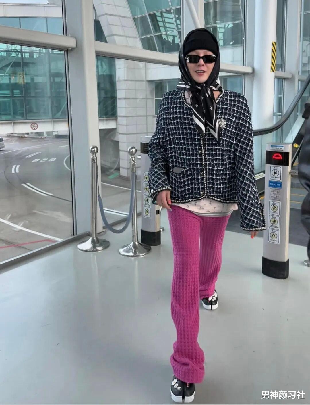 去机场时,他又穿过一件白紫相间的摇粒绒,搭配粉色毛线帽,颜色大胆,但比例克制。帽子只负责点睛,不负责抢戏。