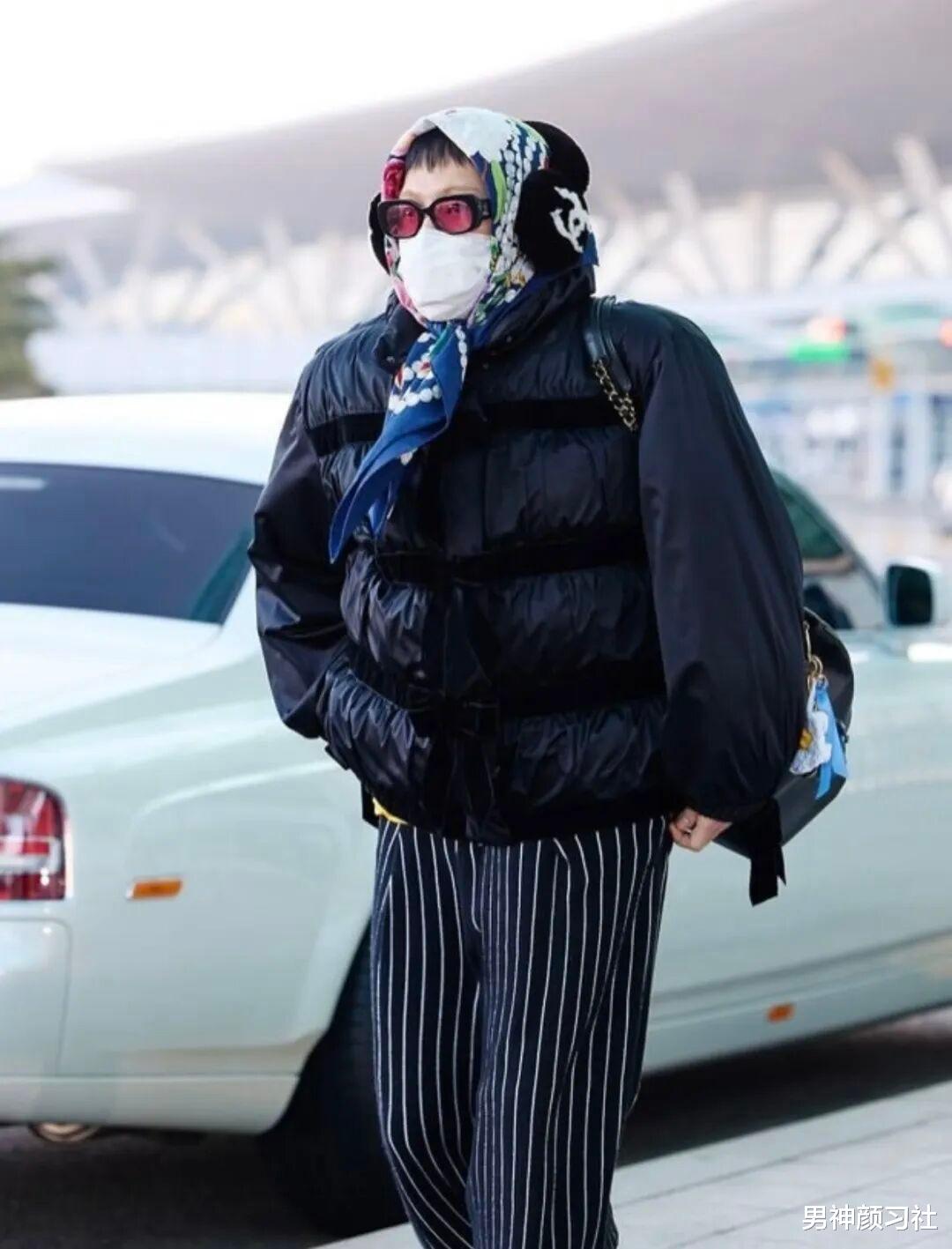 很多男生冬天一到,只剩羽绒服。权志龙也穿,但他从不正常穿。比如黑色羽绒服 + 黑色条纹裤,围巾不是系在脖子上,而是直接披在头上。瞬间从普通保暖变成了造型表达。
