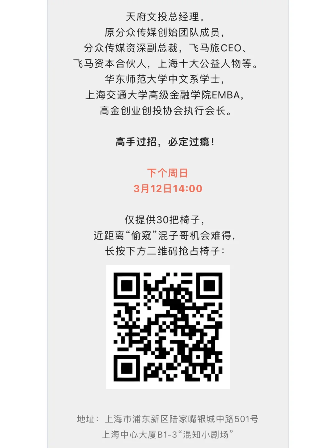 🕙时间:“新书签售会”2023年3月12日11点 “混为一谈”2023年3月12日14点 📍地址:上海市浦东新区陆家嘴银城中路501号上海中心大厦B1-3“混知小剧场” 📝报名方式:扫描图片中对应二维码即可报名~