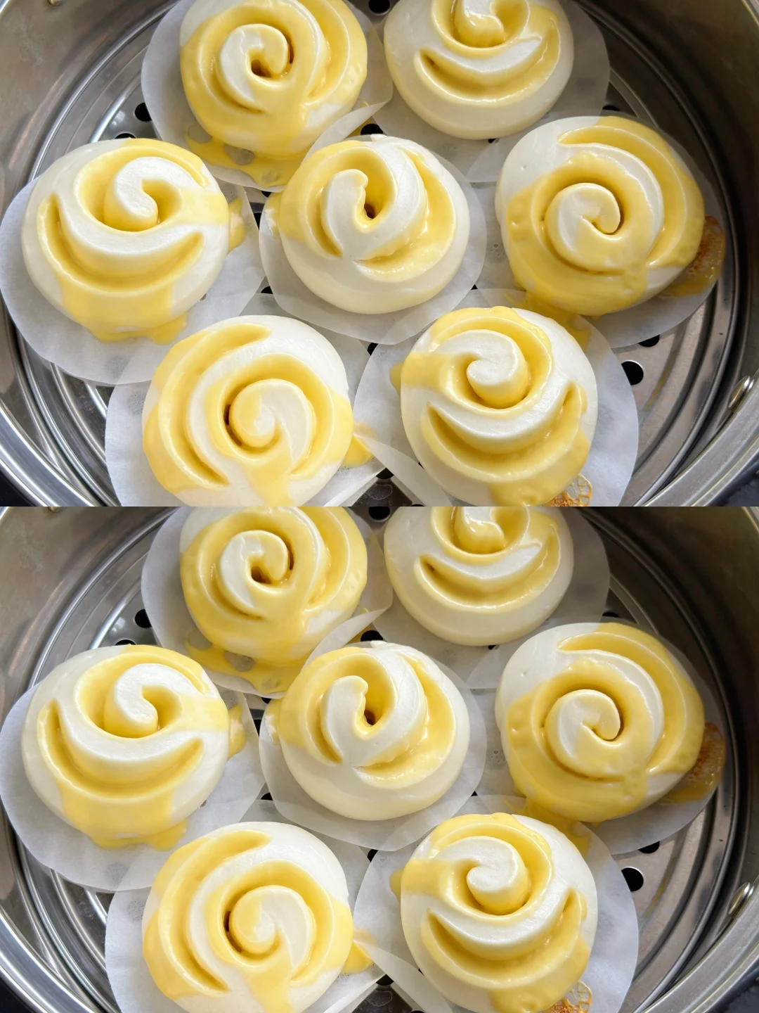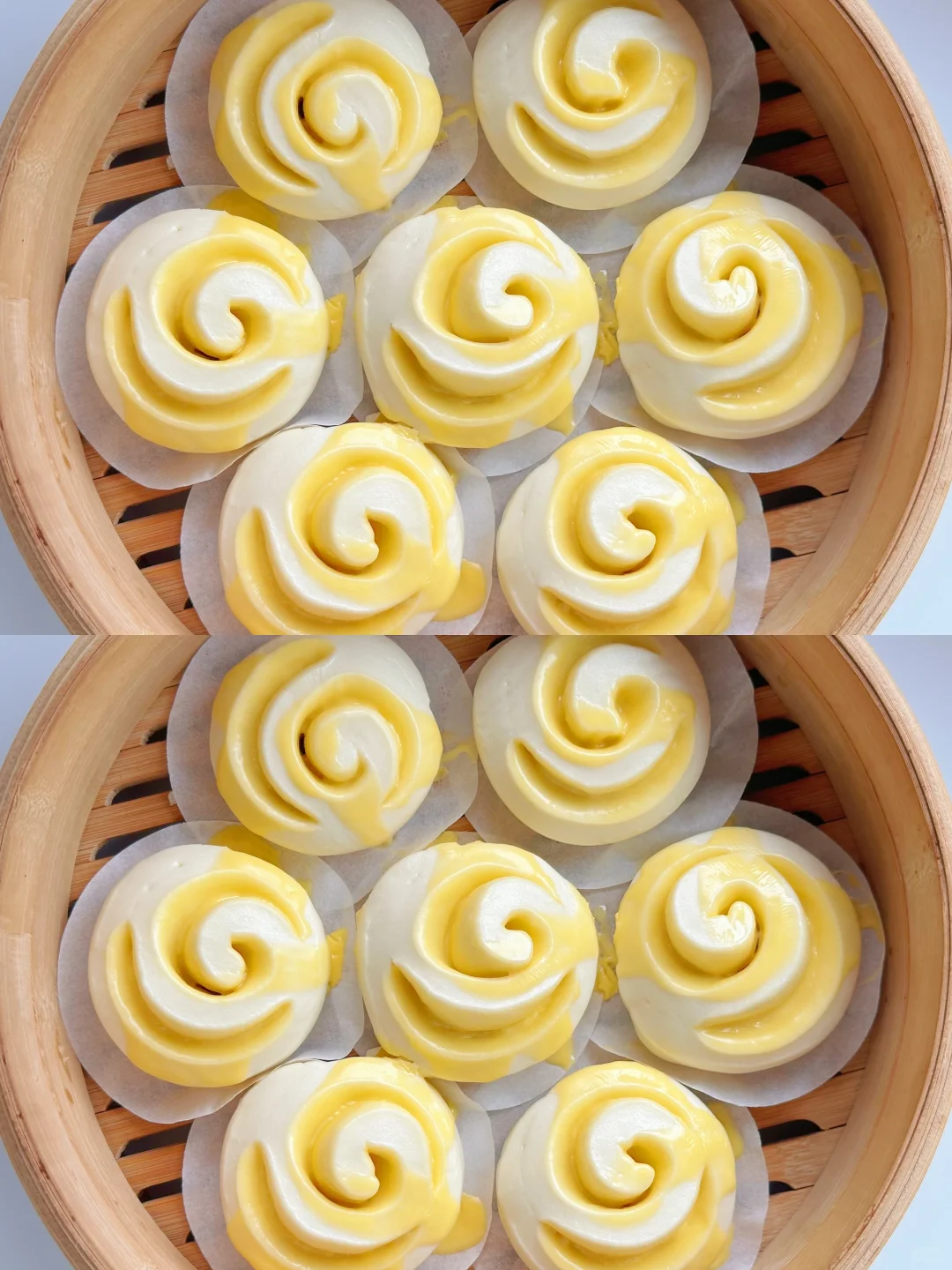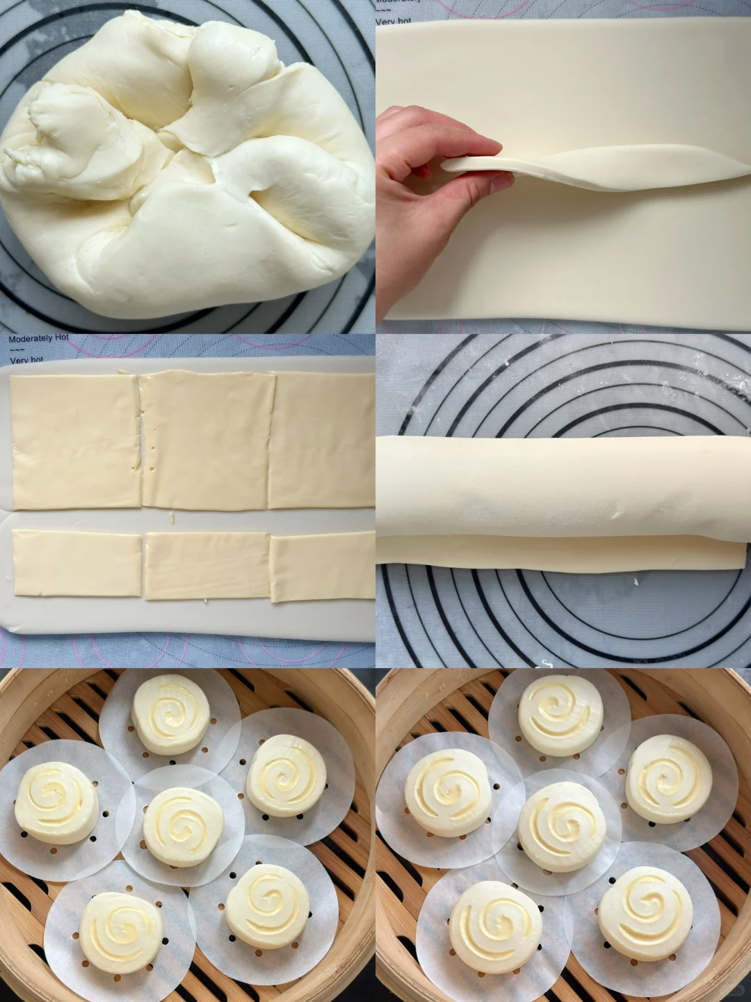3⃣️分切好的馒头胚子稍微整理一下形状,垫上油纸放入锅中发酵,发酵至胚子拿起来明显变轻,胚子明显变大1.5倍,轻摁会慢慢回弹,冷水上锅蒸10分钟焖2分钟即可。