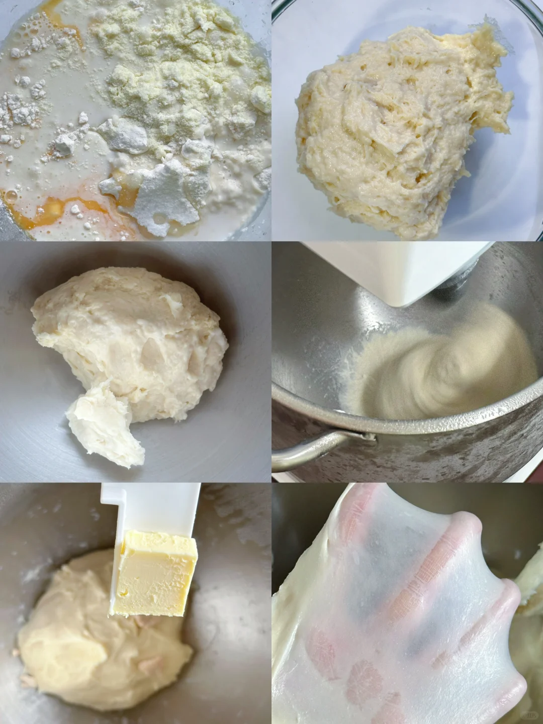 1️⃣提前一天晚上将除黄油、酵母以外的所有面团材料混合成团盖保鲜膜放冰箱冷藏备用。