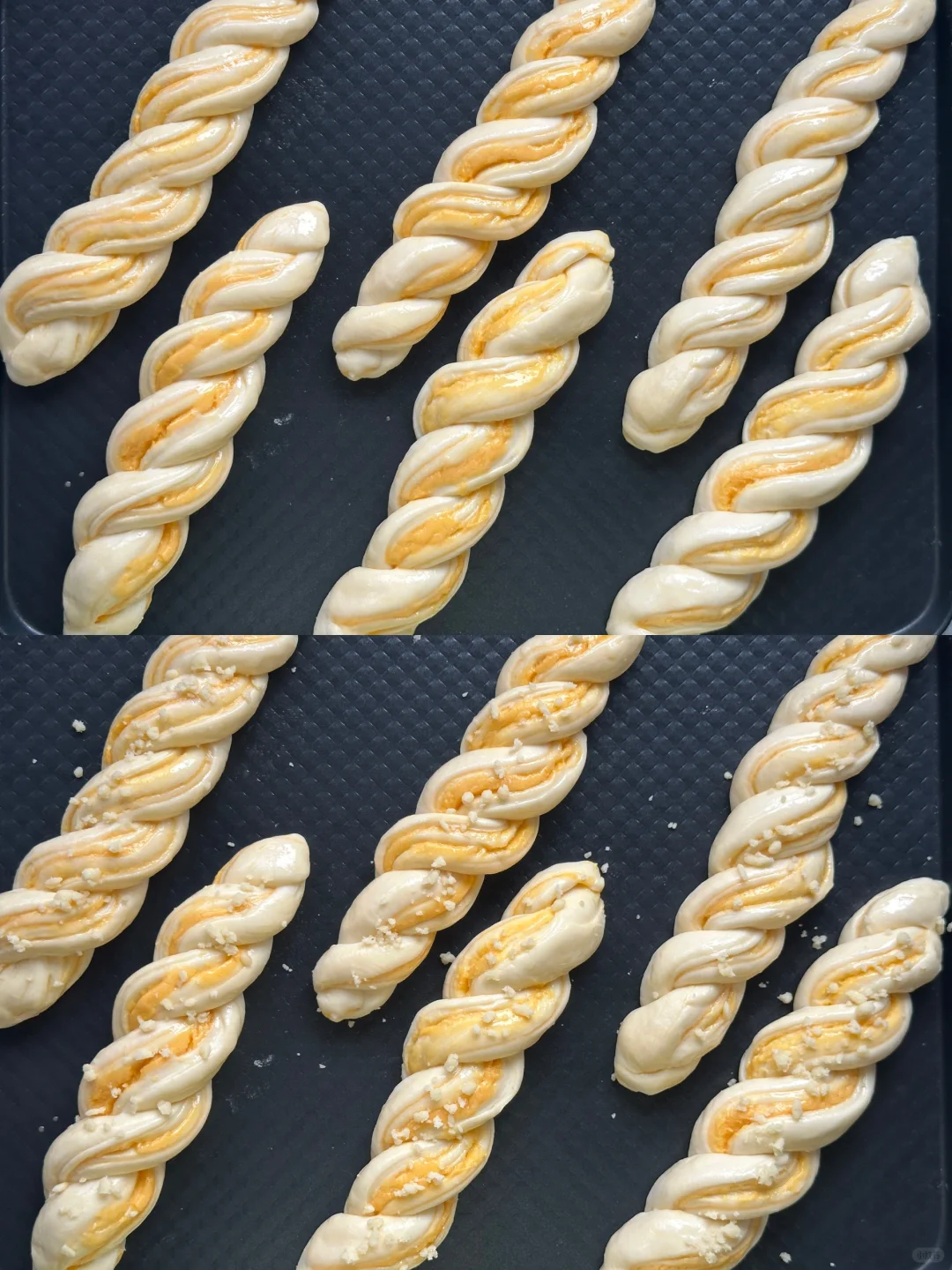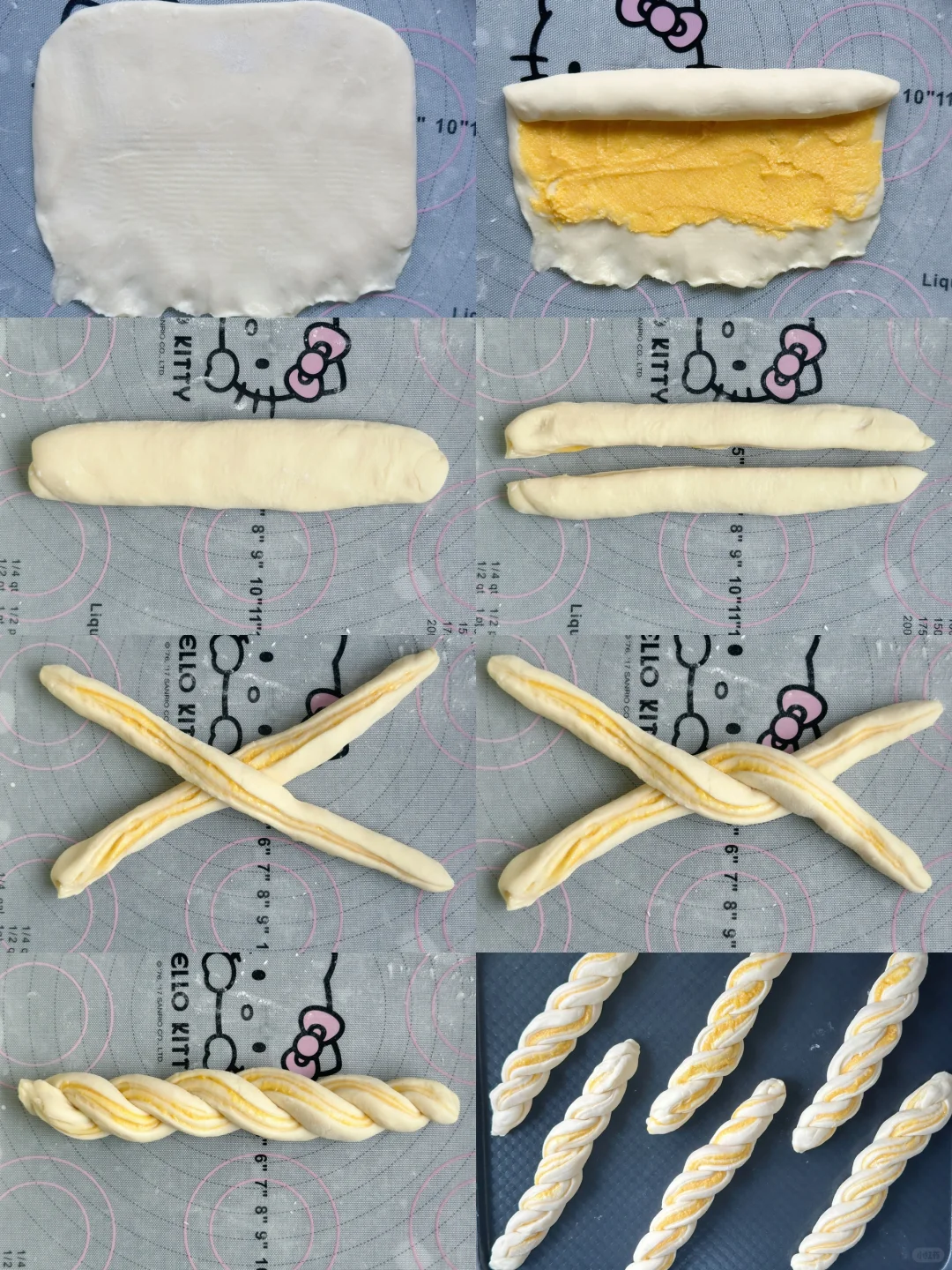 4️⃣松弛好的面团擀成16×12cm面片,翻面,抹馅料,从上往下卷起,收口捏紧。收口朝下,将面团稍按扁,从中间切开,切面朝上,交叉折叠成麻花状,收口捏紧。