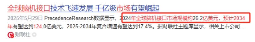 市场规模方面,根据Precedence Research数据,预计到2034年全球脑机接口市场规模将增长到约124亿美元,2025-2034年CAGR为17%。