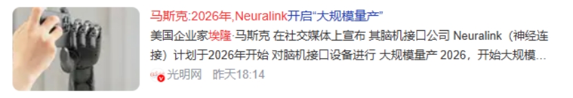 2025年12月31日,埃隆.马斯克在社交媒体上表示,其脑机接口公司Neuralink将于2026年开始对脑机接口设备进行“大规模生产”,还将在脑机植入方式上实现创新。