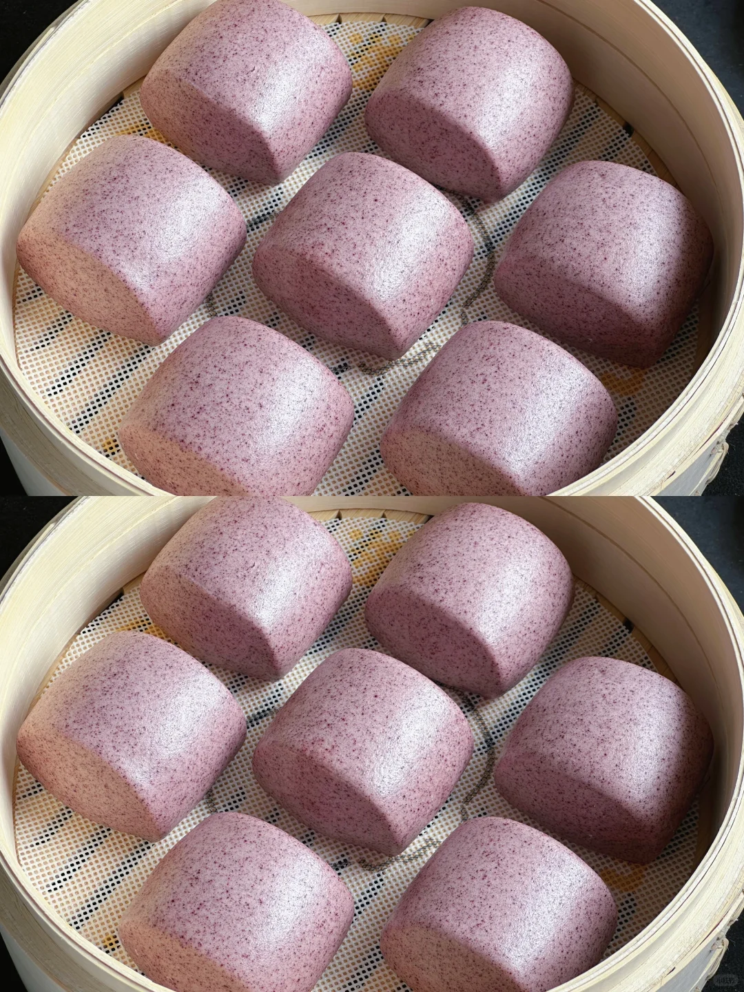 🌈配方:中筋面粉420g,黑米粉80g,牛奶255g,猪油10g(可不放),白砂糖15g(可不放),鲜酵母12g。