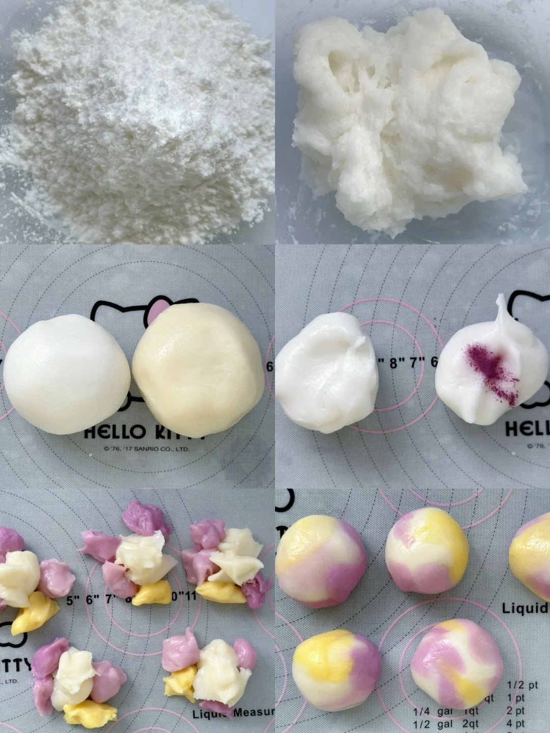 1️⃣冰皮预拌粉➕开水混合成团,揉光滑,份成小份,分别加入适量紫薯粉、南瓜粉,搓长条,放一起,切成35g/个的小剂子备用。