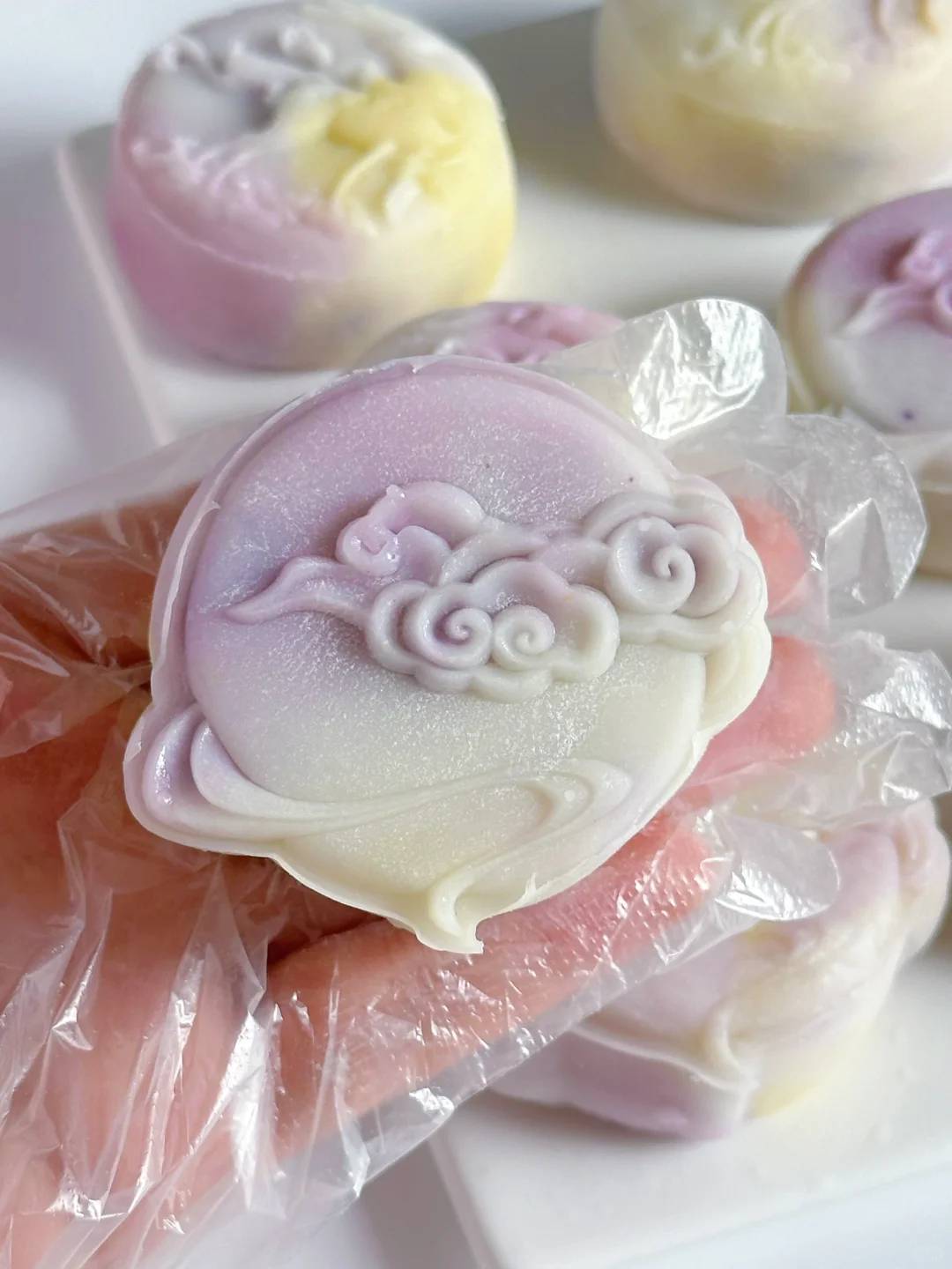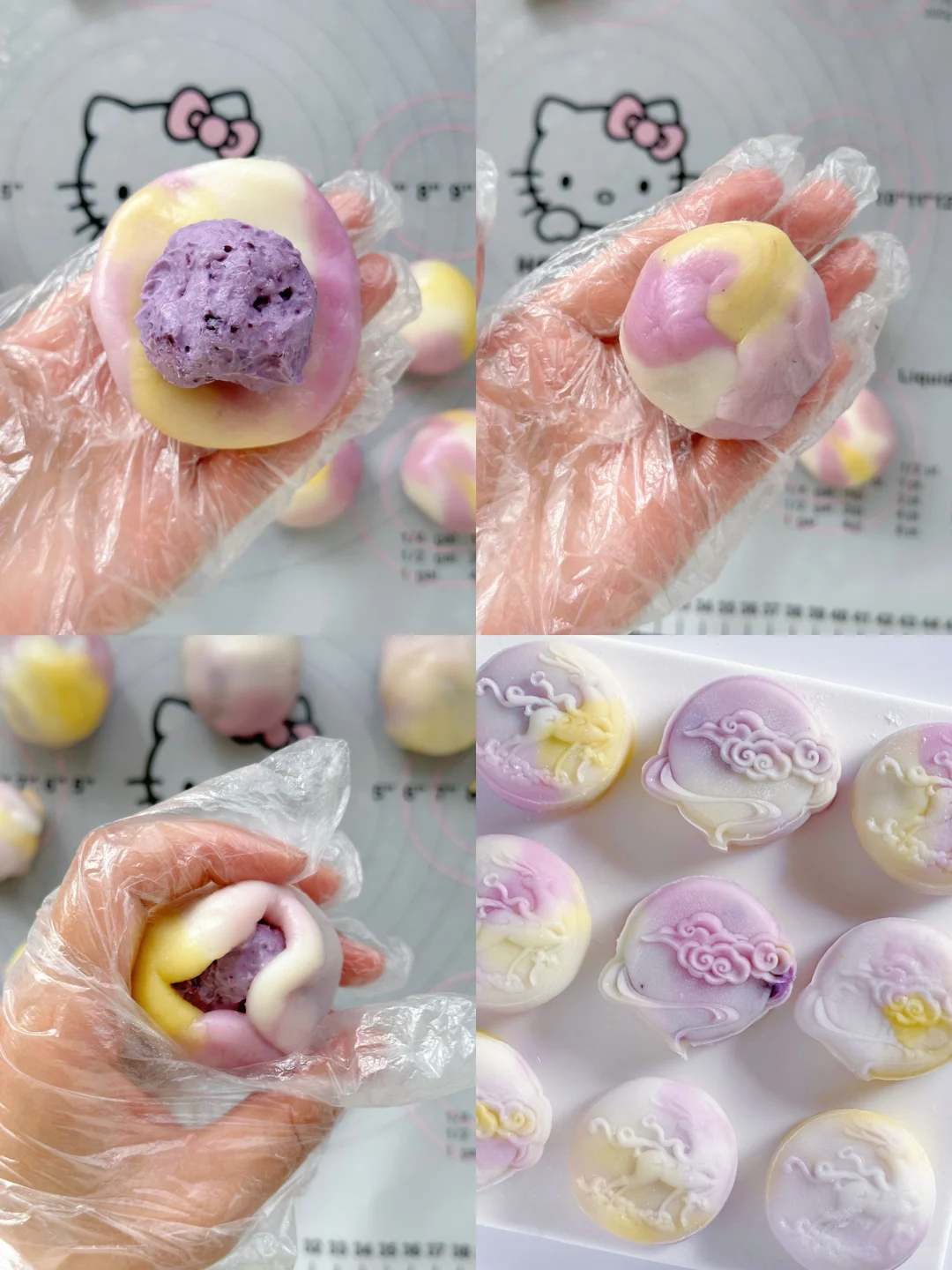 5️⃣ 取一个小剂子搓圆压扁,放上馅料,虎口收紧,搓圆。全部包好后,表面粘一点熟糕粉,放入模具压出花型、脱模即可。