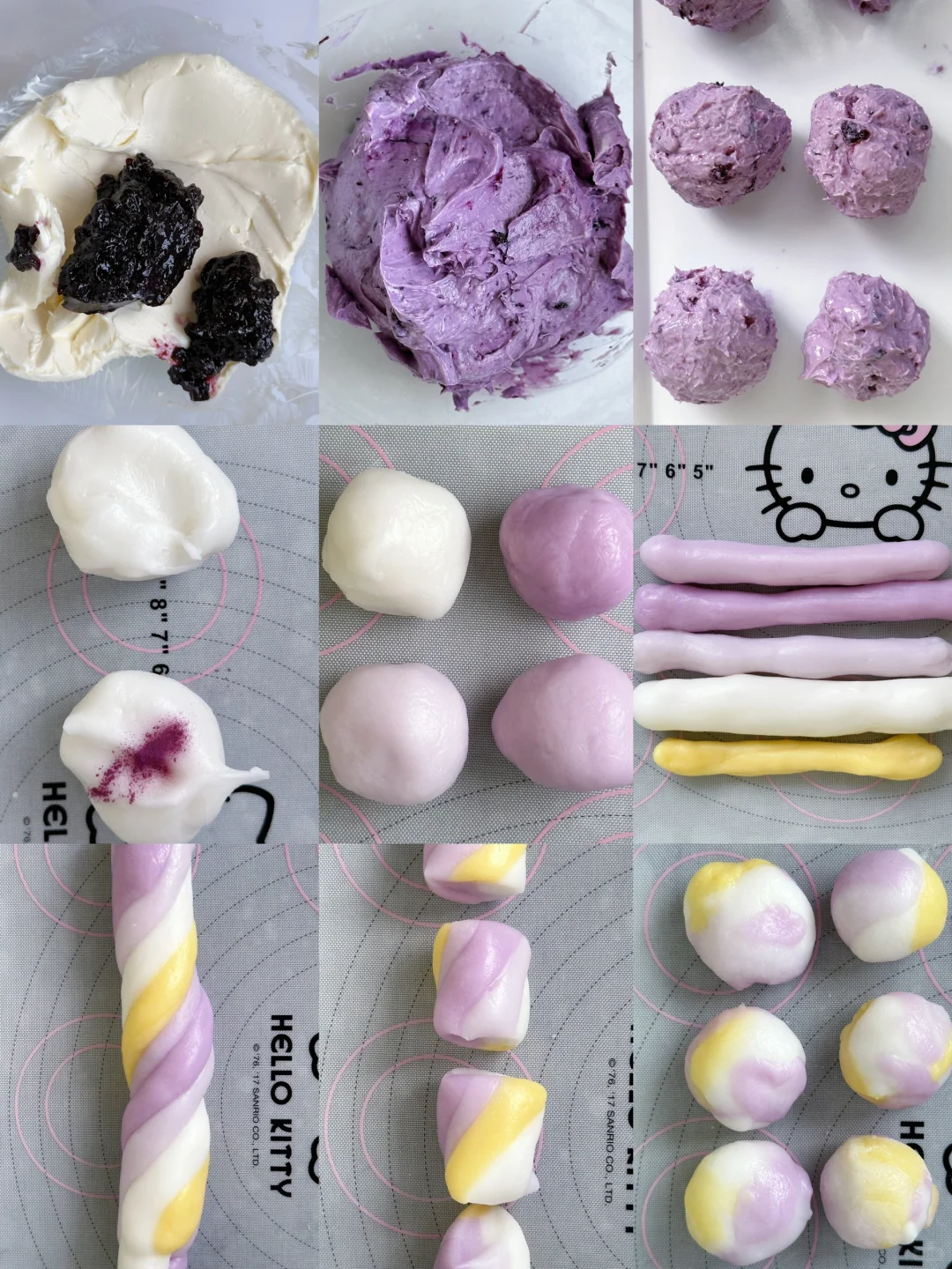 奶油奶酪软化➕细砂糖➕蓝莓酱拌匀,冷冻30分钟,分成40g/个。