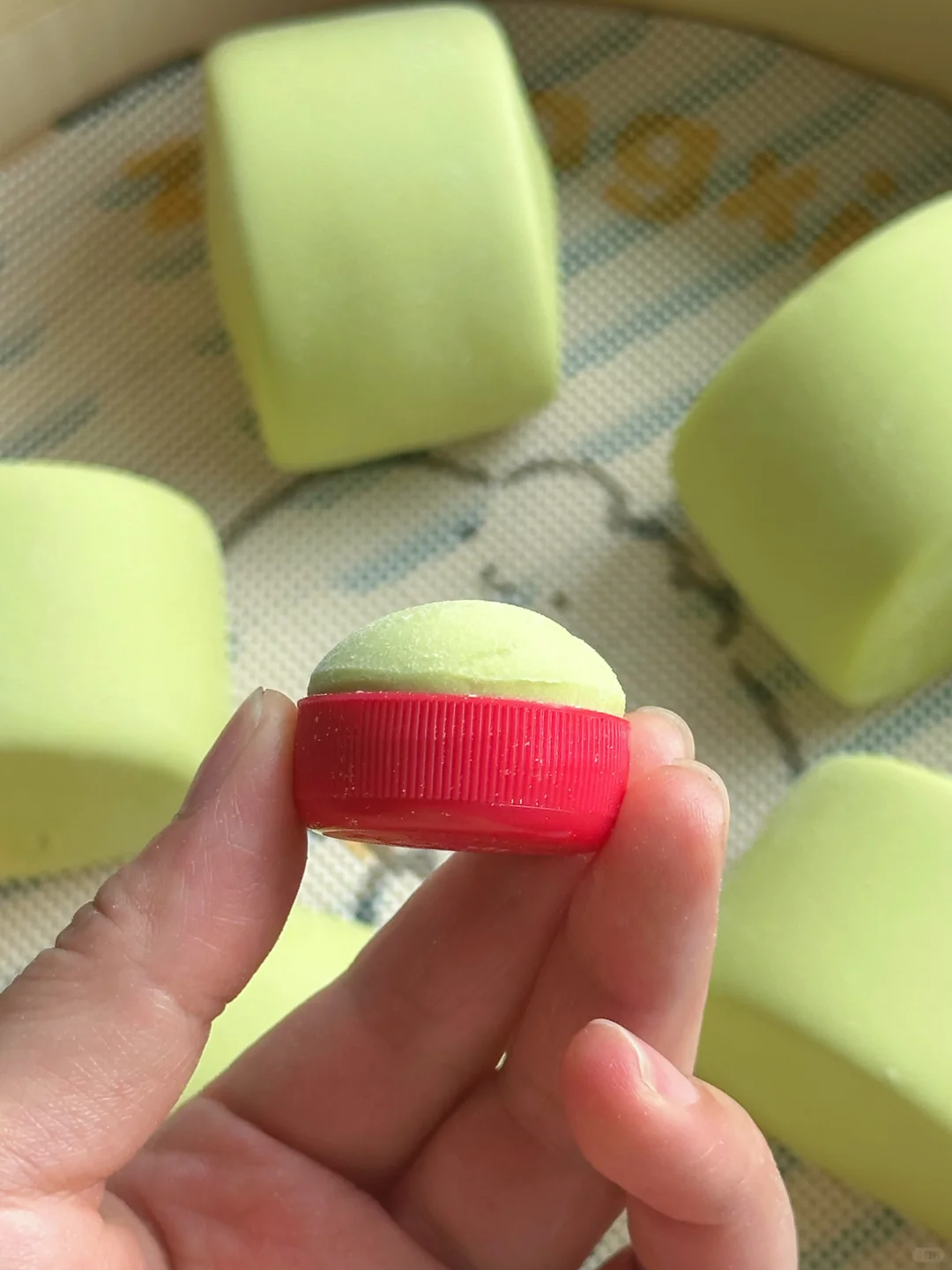 🔸🔸馒头胚整型好后,留一小团面放入瓶盖内,压平,与瓶盖高度一致。放置与馒头胚相同的环境下发酵。面团发酵高度(面团冒出来的高度)为瓶盖高度的一半为1.5倍。一般发酵1.5~2倍大即可。自己再结合馒头的发酵状态判断一下