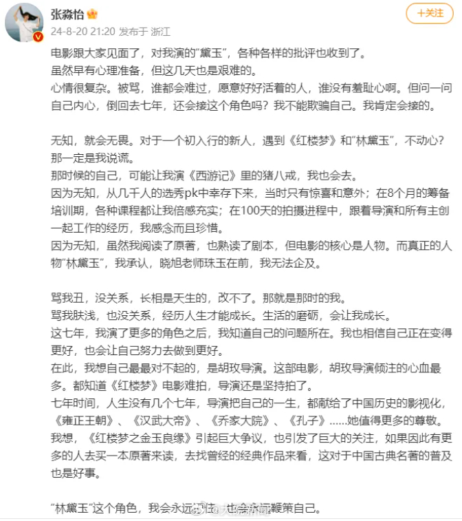 【#新黛玉张淼怡回应长得丑等争议#】近日,由胡玫导演的电影《红楼梦之金玉良缘》上映后遭遇票房、口碑双扑街。其中林黛玉扮演者张淼怡被指“丑”,气质长相不符合林黛玉一角,其在路演中称林黛玉“特立独行、离经叛道”的言论更是引发争议。8月20日晚,张淼怡发长文进行回应。