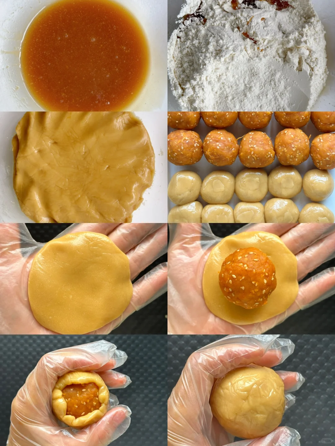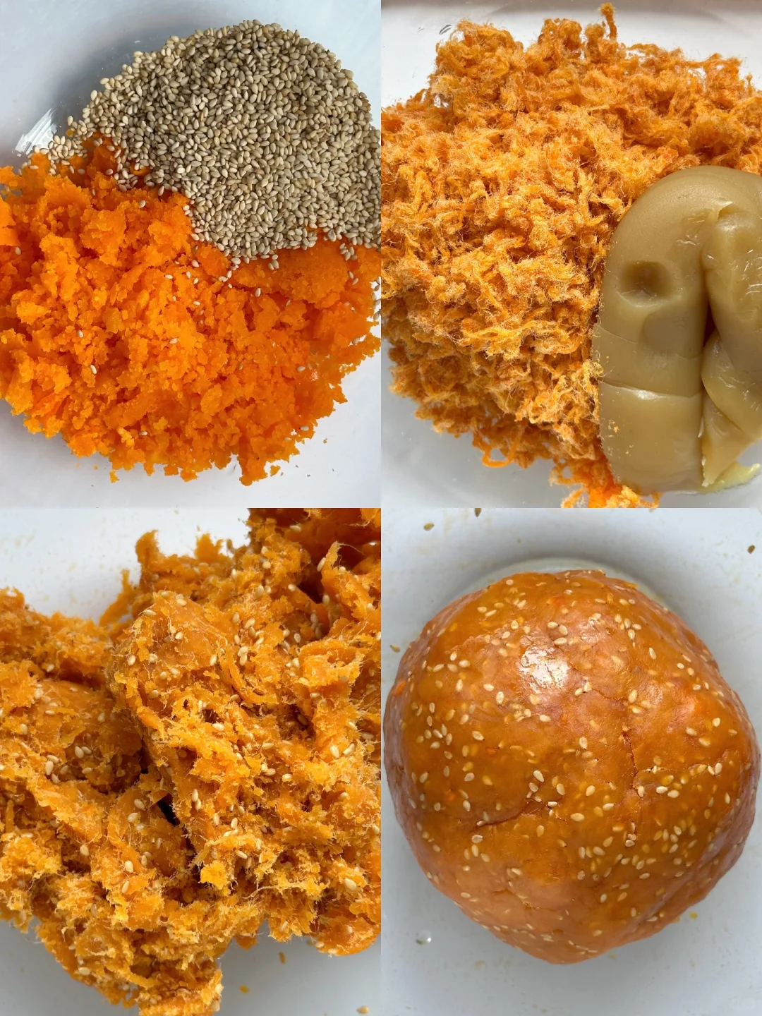 🔹咸蛋黄喷少许白酒上锅蒸熟或者用烤箱烤熟,压成泥,加入芝麻、肉松、莲蓉馅抓匀。馅料分成45g/个