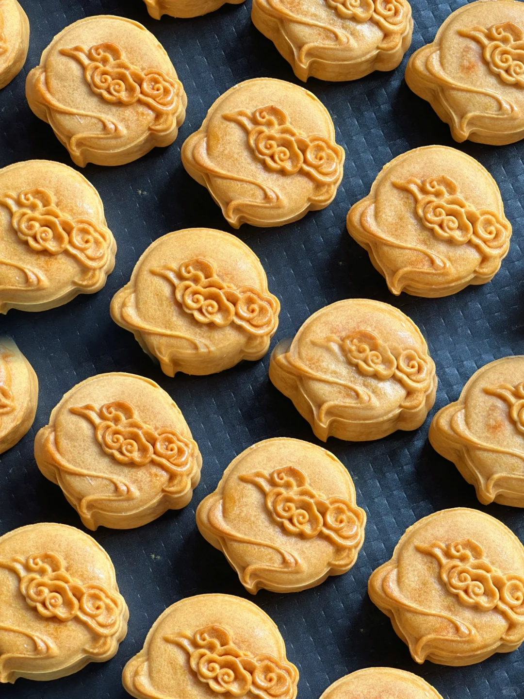 🔹蛋黄水:蛋黄➕水➕糖浆混合均匀。月饼晾至不烫手开始刷薄薄一层蛋黄水,再次送入烤箱160度烘烤15~18分钟左右。