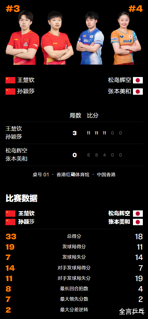 第三局背水一战的松岛辉空/张本美和在开局落后的情况下反超比分,打出了比较高的进攻质量,不过王楚钦/孙颖莎很快便在3-4短暂落后的情况下连赢4分逼日本队用掉暂停机会。暂停结束后,王楚钦/孙颖莎继续发力以10-4拿到赛点,再赢1球后以11-4结束战斗晋级。