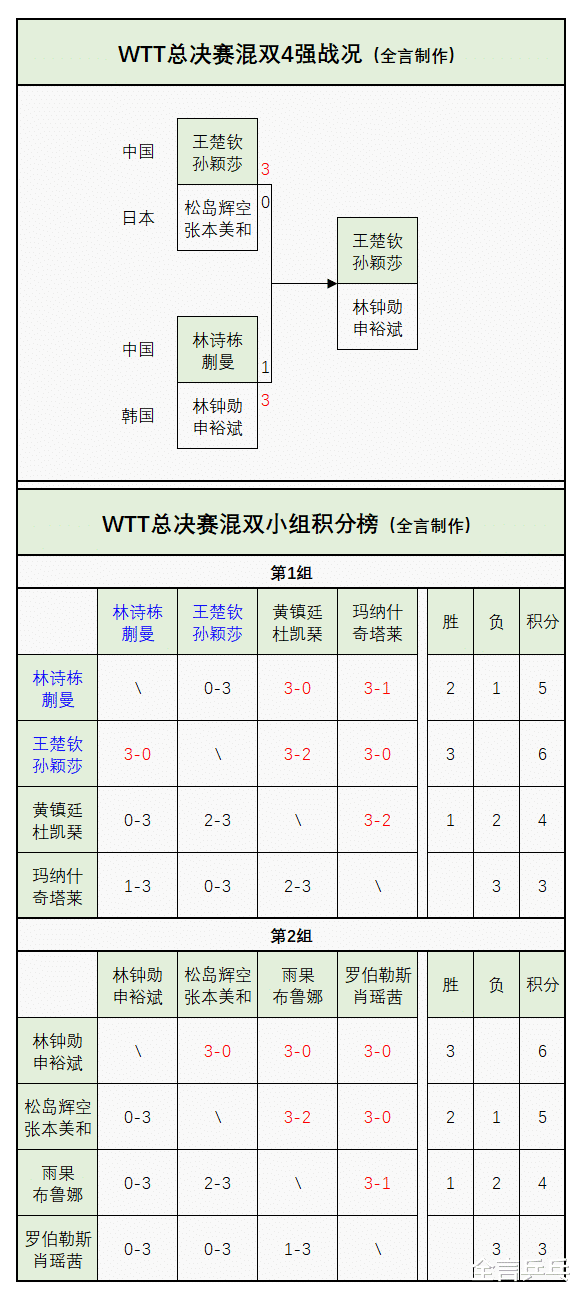 本次比赛王楚钦/孙颖莎在混双第1组循环赛中连赢3场过关,松岛辉空/张本美和差点在第2组被淘汰,2胜1负才获得晋级,随后又挑战“莎头”组合,想晋级恐怕不容易。