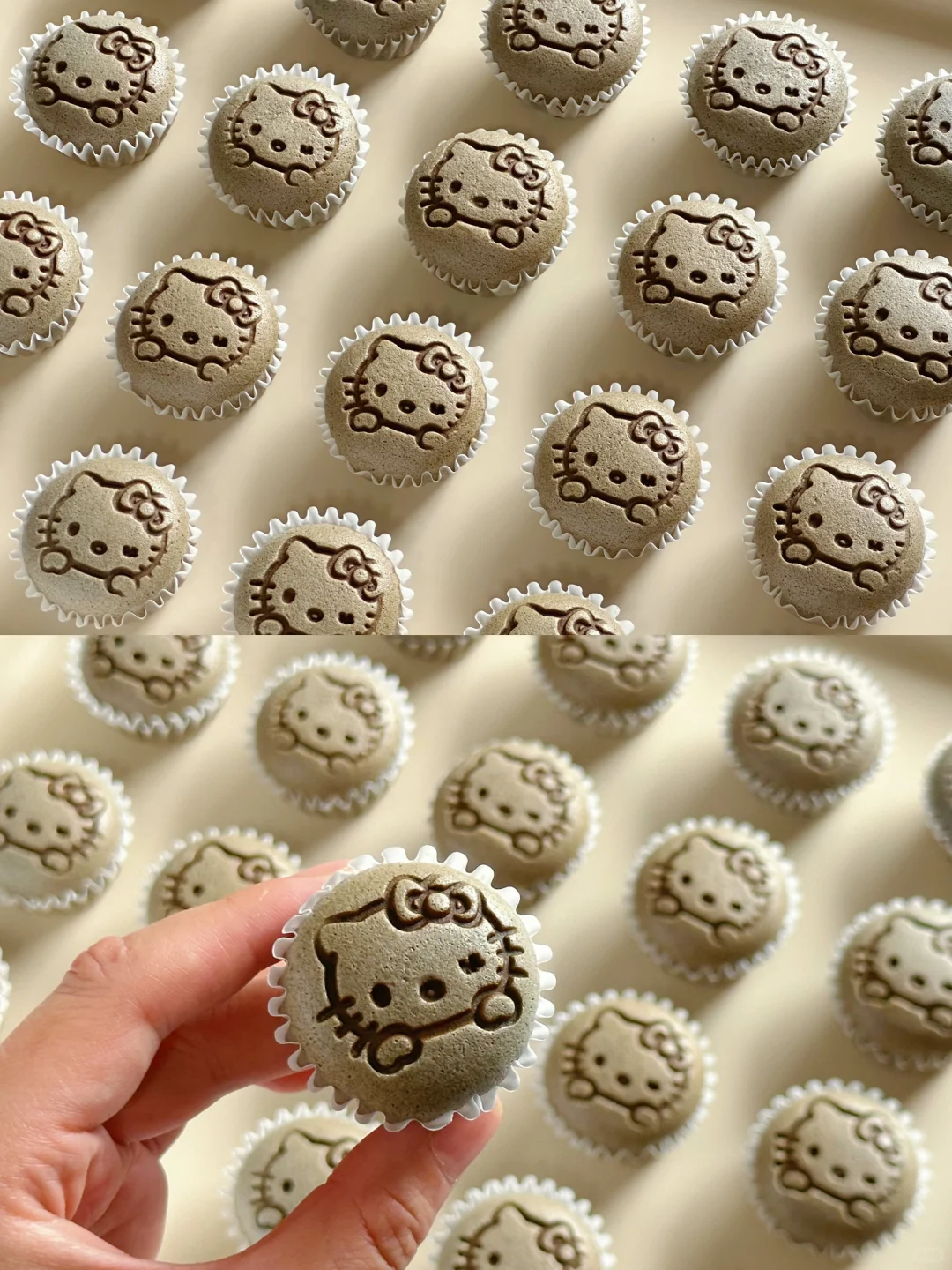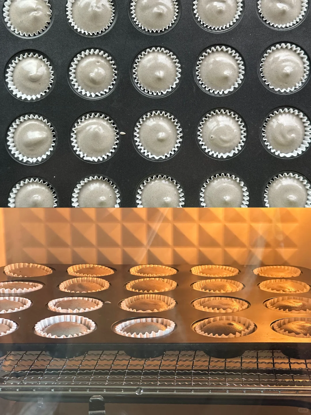 💞将混合好的面糊倒入裱花袋中,裱花袋剪一个口子,将面糊挤入纸杯,挤至八分满。(面糊太少了烤出来不圆润饱满,太满了会开裂)