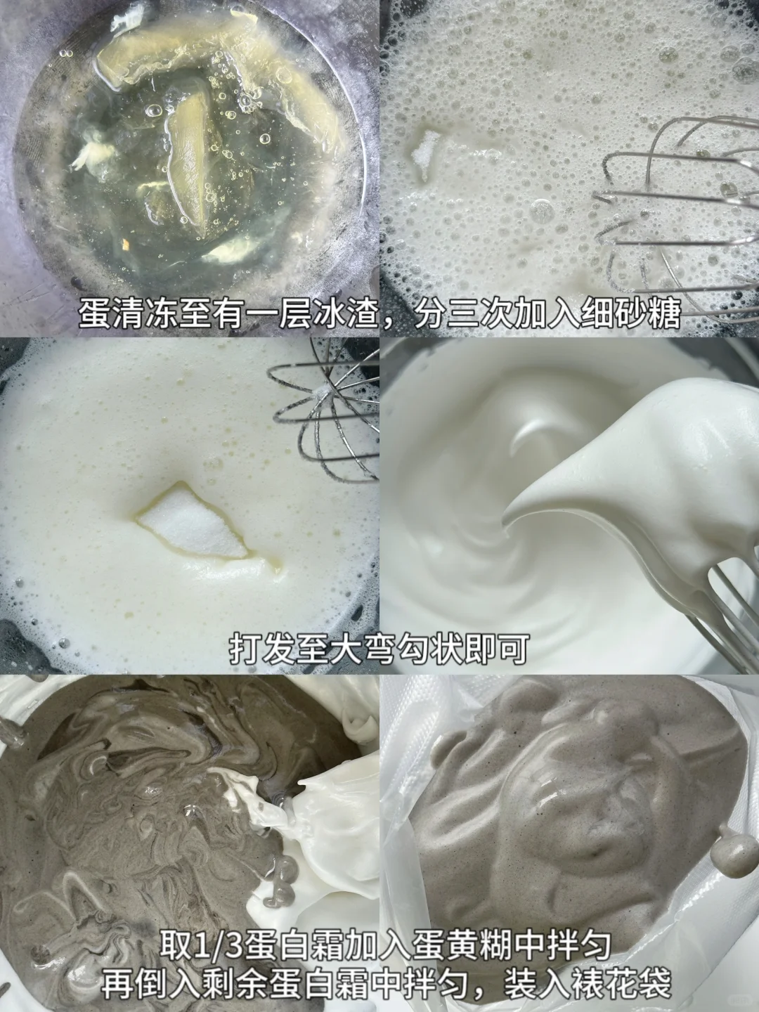 💞蛋白冷冻至表面结一层冰渣取出,滴入几滴柠檬汁,加入细砂糖,打发至提起打蛋头出现小弯角。