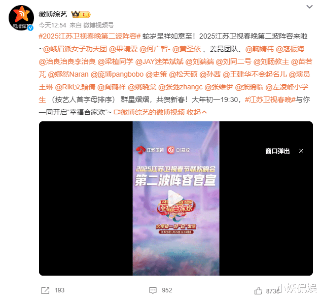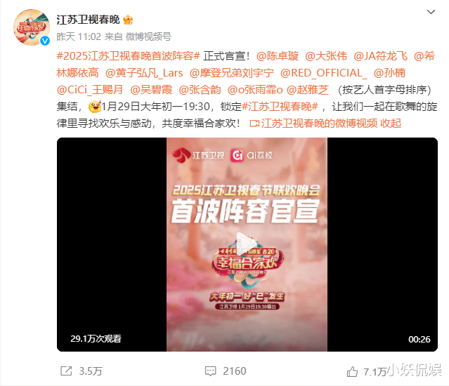 随着 2025 江苏卫视春晚的日益临近,这份充满惊喜的嘉宾名单让观众对这场晚会充满了期待。歌手们将用动人的歌声唱响新春的旋律,脱口秀演员和喜剧演员将用幽默诙谐的表演带来欢乐的笑声,而这只是前两波官宣嘉宾名单,后面还有,你又期待后面谁被官宣呢?