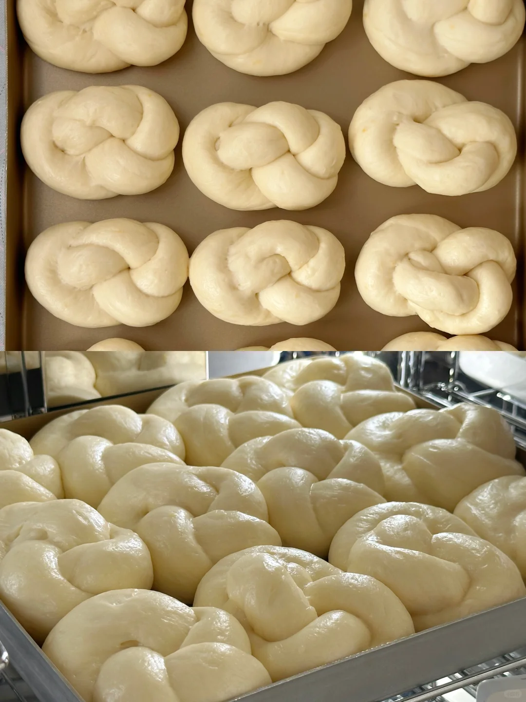 6⃣️整形好的面团放入28*28的方盘中,所有面团做好后放发酵箱温度35°C,湿度75%发酵60分钟左右,大概2倍大小,面包之间没有什么空隙。