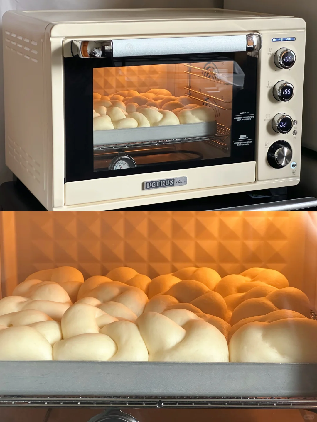 出炉刷黄油面包看起来会比较亮,我忘记融化黄油,懒得折腾,就将就碗底一点点刷了下,色泽就不光亮,不那么好看。不过烤箱的整体上色还是很不错的,毕竟M型发热管受热还是比较均匀。