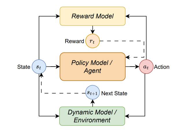 在基于模型的强化学习(MBRL)中,智能体构建环境的内部模型。该模型通常包括动态模型、奖励模型和策略模型。智能体利用该模型模拟与环境的交互,从而帮助其做出更优决策,如图19所示。智能体不单纯依赖现实世界的交互,而是从收集的经验中学习动态模型和奖励模型,随后在模拟环境中进行规划或策略学习。这种环境建模与策略优化的解耦显著提升了样本效率,尤其在数据收集成本高、速度慢或高风险的场景中价值显著。