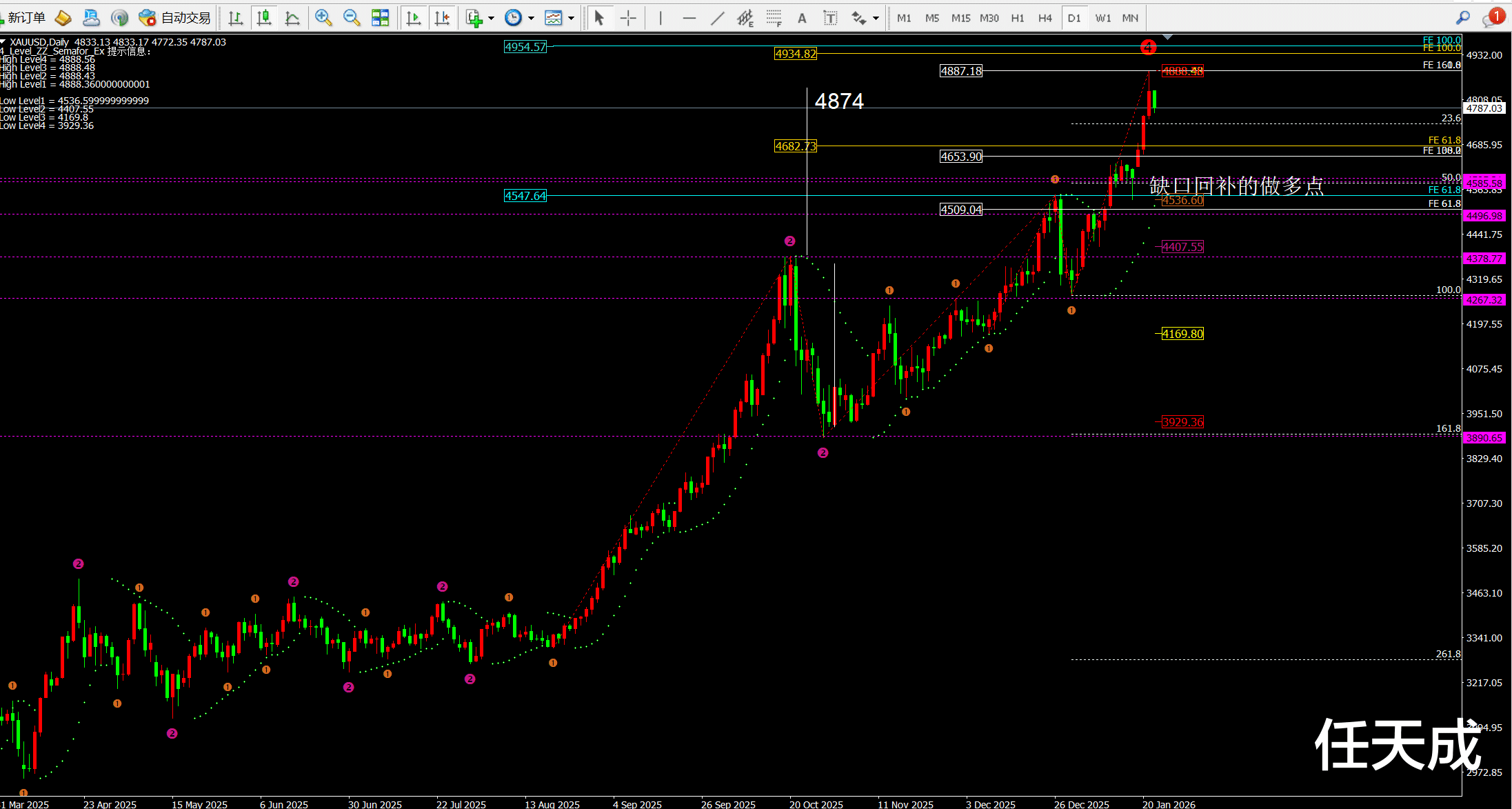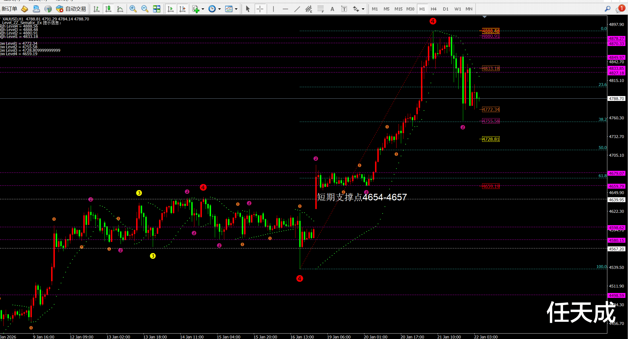 如果价格高位震荡且没跌破昨日低点,那么今日高点就还没出现,短期4833会进行破位的。参与多单的点位在4772-4765区间最佳。