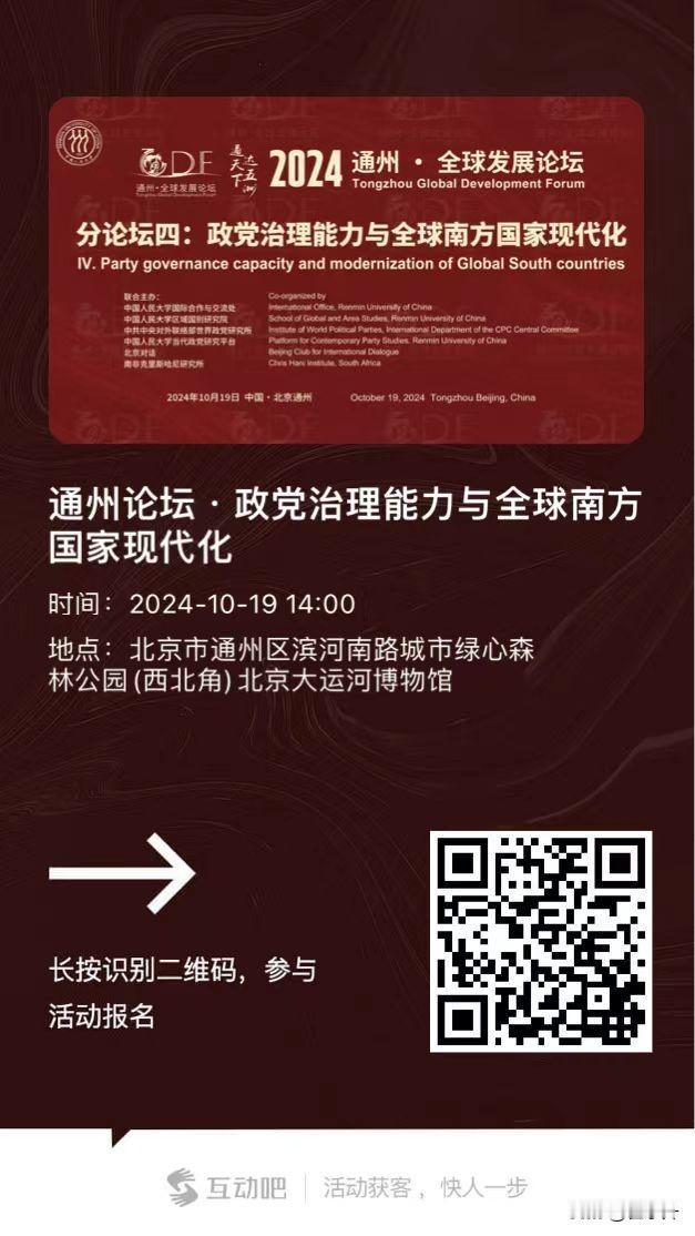 “通州·全球发展论坛”第四分论坛“政党治理能力与全球南方国家现代化”即将举办,诚邀感兴趣的朋友们莅临! “通州•全球发展论坛”由中国人民大学创办,与通州区政府联合主办,致力于“关注全球发展、关怀人类命运”,为全球政界、学术界、商界提供高端对话平台,围绕全球发展、安全、文明三个主题纬度产出高质量研究成果。 10月19日下午,我将作为平行第四分论坛“政党治理能力与全球南方国家现代化”的主持人之一,与来自全球的嘉宾朋友相聚于北京大运河博物馆,共同聚焦全球南方国家政党治理能力和国家现代化发展过程中面临的挑战和机遇。中国作为“全球南方”的一员和最大发展中国家,愿意与各国分享和交流治理经验,共同探索发展中国家实现现代化的路径。 “政党治理能力与全球南方国家现代化”分论坛将由中国人民大学副校长郑新业致欢迎辞。分论坛的上半场主题为“全球南方国家政党治理能力的现代化”,我们很荣幸的邀请以下嘉宾到场发言。 •南非共产党总书记索利·马派拉 •尼泊尔共产党(毛主义中心)总书记德沃·古隆 •中共中央对外联络部原副部长及中国国际交流协会副会长艾平 •津巴布韦非洲民族联盟—爱国阵线中央政治局委员及契特波思想政治学院院长蒙亚拉兹·马查查 •中联部研究室主任及世界政党研究所所长金鑫 •中国青年政治学院党委常委及副院长廉思 上半场分论坛由中国人民大学国际合作与交流处处长、国际组织学院院长张晓萌主持。我将主持下半场论坛,主题为“全球南方国家发展的现代化”,发言嘉宾有: •委内瑞拉西蒙玻利瓦尔研究所战略分析与传播部主任吉列尔莫·巴雷托 •坦桑尼亚工程与制造业设计组织主席及总统高级顾问约瑟夫·辛巴卡利亚 •中国人民大学国际关系学院教授及浙江(嘉兴)中外政党研究中心主任周淑真 •中国农业大学国际发展与全球农业学院院长及人文与发展学院国际发展领军教授徐秀丽 •中国社会科学院世界经济与政治研究所研究员及国家全球战略智库综合研究部主任徐秀军。 通州论坛采用中英双语,将汇聚全球各界学术和政党专家,欢迎感兴趣的朋友们报名第四分论坛,共同探讨有关政党治理能力与全球南方国家现代化的重要问题。 由于本次活动场地有限,请感兴趣的朋友扫描二维码或通过小程序链接报名。校内学生报名后即可参会,校外观众报名以审核结果为准,成功后将发送具体活动日程及参会安排。本次论坛免费,受邀听会者交通请自理。