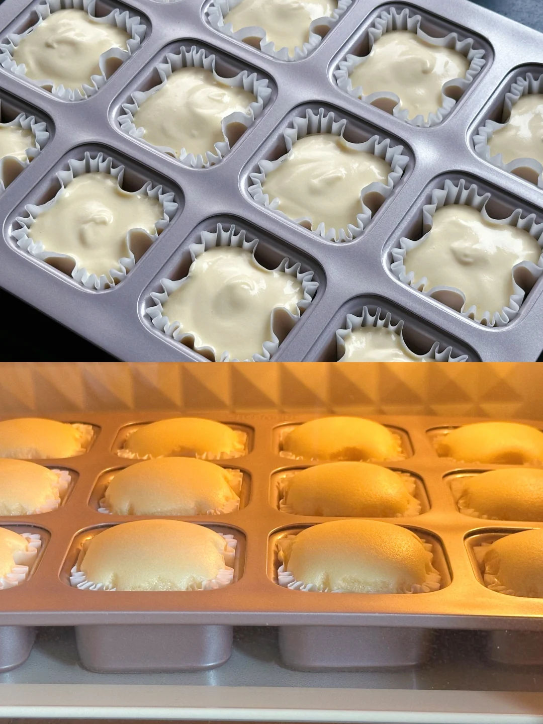 💞将混合好的面糊倒入裱花袋中,裱花袋剪一个口子,将面糊挤入纸杯,挤至八分满。(不要挤太多会冒出来一节,我就是挤得有点过了,主要是面糊有点多,不想浪费…)