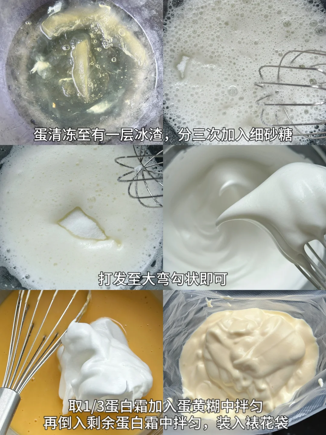 💞蛋白冷冻至表面结一层冰渣取出,滴入几滴柠檬汁,加入细砂糖,打发至提起打蛋头出现大弯角。