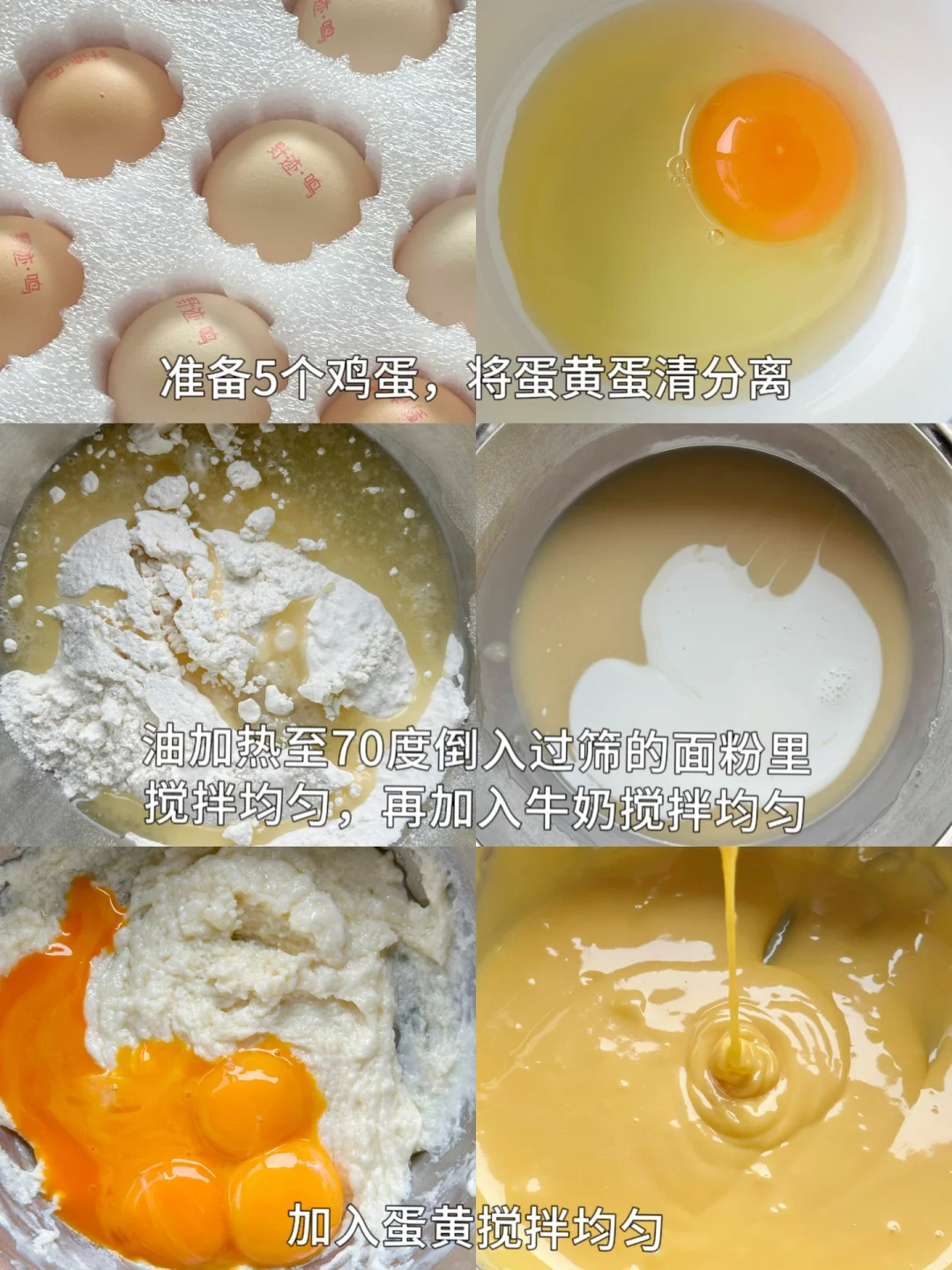 ▪️面粉吸水性不一样,鸡蛋大小不一样,水量添加会有差异,主要参考蛋黄糊的稠度,如图。