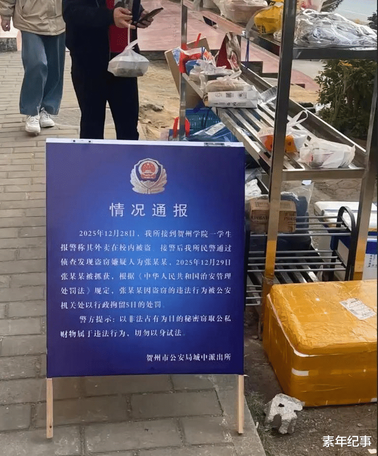 事情起因并不复杂。2025 年 12 月 28 日,该校一名学生报警称外卖被盗。民警接警后迅速调查,次日抓获嫌疑人张某某,其对盗窃行为供认不讳。依据《中华人民共和国治安管理处罚法》第四十九条,警方作出行政拘留 5 日的处罚决定。为起到 “以案释法” 的警示教育作用,派出所将通报贴在外卖架旁,让取餐同学直观看到。学校回应称,立牌为警方行为,具体以警方通报为准。