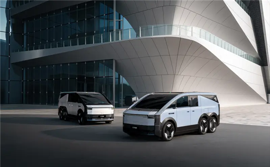 外观部分,新车此前已完成发布,整体造型类似于MPV,采用3轴6轮的设计,长宽高分别为5500mm*2000mm*2000mm。其中前大灯造型与全新小鹏P7十分相似,大角度倾斜的A柱则能够有效降低风阻。