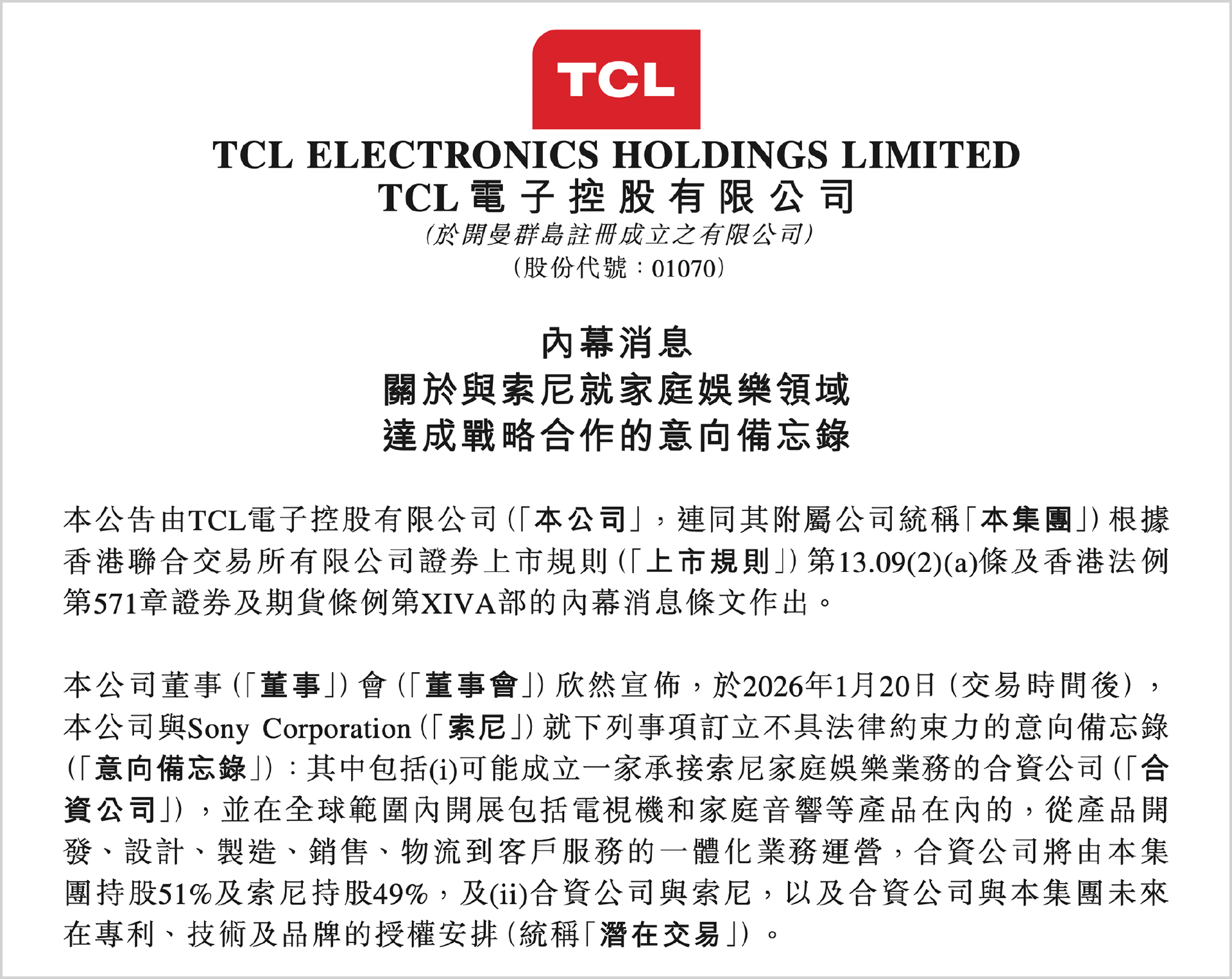 TCL电子和索尼同时公告称,计划成立一家家庭娱乐合资公司,整合索尼旗下从电视、音频到内容服务的完整生态,新公司预计于2027年4月正式投入运营。