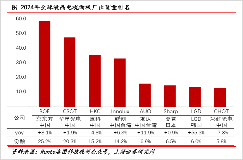 到2024年,全球液晶面板出货量TOP10中,中国(包括台湾地区)企业独占六席,京东方和TCL华星合计瓜分了高达46%的市场,而日本仅剩夏普一根独苗。