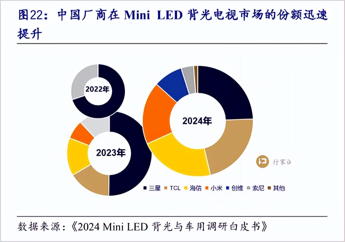 其中,TCL是最早量产Mini-LED电视的厂商,还集合了半导体显示材料、面板、模组到整机的全栈链条;海信收购东芝、夏普(北美电视、墨西哥工厂),旗下还有乾照光电,在芯片调教、器件、整机领域不断加大筹码;而小米、华为则凭借强大的生态系统和品牌力,形成强大的智能家居体系,相较来看,三星的Tizen系统像一个封闭的孤岛。