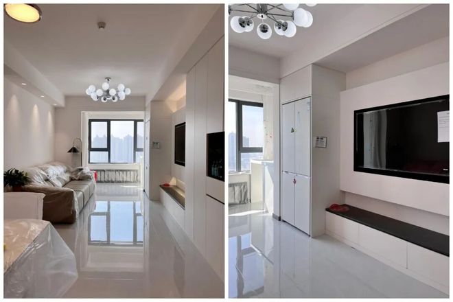 既然沙发墙可以摆放冰箱,那么电视墙自然也可以摆放了。可以单独放,也可以冰箱柜做内嵌。