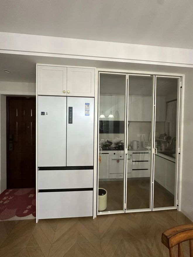 做法并不复杂,只需要面向餐厅做一组柜子,然后将冰箱嵌进去,同时保证厨房门洞有较舒适的出入动线空间。