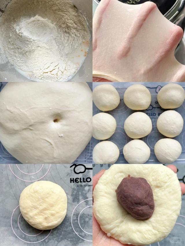 1️⃣ 除黄油外的所有面团食材(包括烫种)放入厨师机桶内,厨师机1或2档搅拌至无干粉,切换至4-5档打至能扯出厚膜,加入软化好的黄油开2档揉至黄油吸收,再切换至4-5档揉至完全拓展阶段,能扯出薄膜即可。