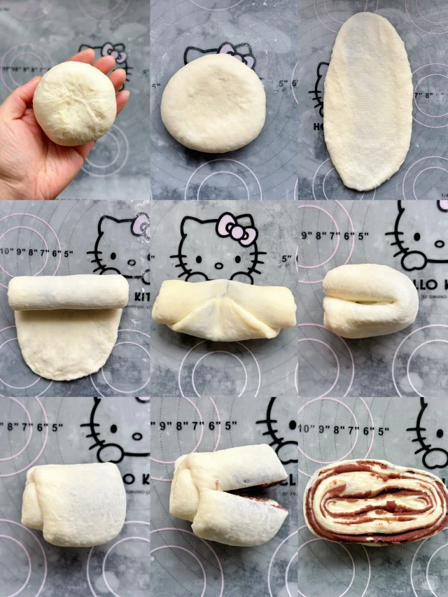 3️⃣ 取一个松弛好的面团,压扁,拍掉大气泡,翻面,包入40g左右的豆沙馅。收口捏紧,收口向下,稍微压扁,用擀面杖擀开,翻面,从上至下卷起,收口处朝上对折面团,再从中间切一刀,如图。切面超两边打开,切面朝上放入模具。3个为一组放入模具。